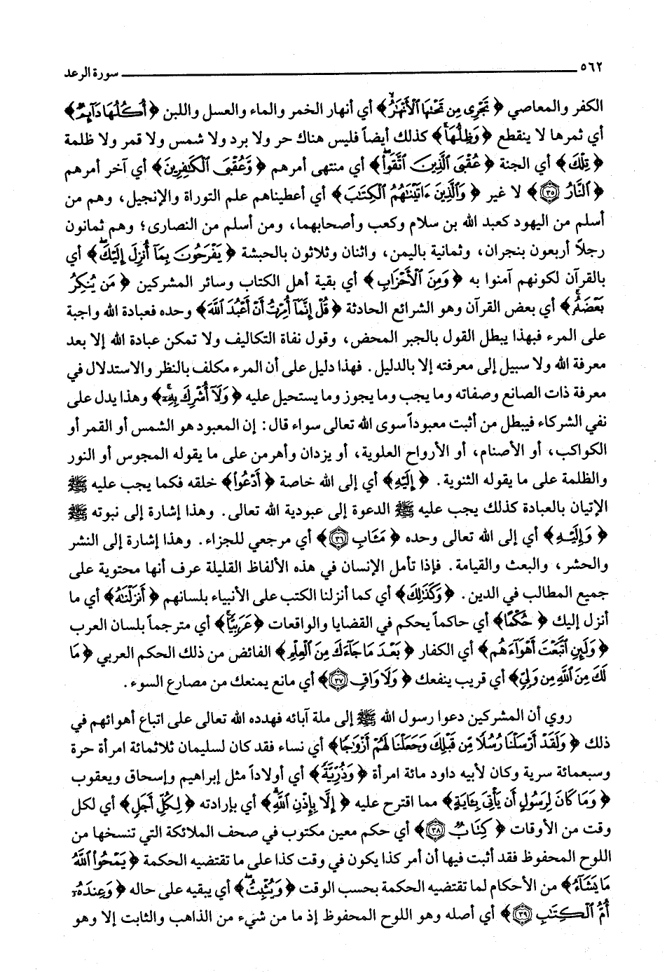 الكفر والمعاصي تَجْرِي مِنْ تَحْتِهَا الْأَنْهارُ أي أنهار الخمر والماء والعسل واللبن أُكُلُها دائِمٌ أي ثمرها لا ينقطع وَظِلُّها كذلك أيضا فليس هناك حر ولا برد ولا شمس ولا قمر ولا ظلمة تِلْكَ أي الجنة عُقْبَى الَّذِينَ اتَّقَوْا أي منتهى أمرهم وَعُقْبَى الْكافِرِينَ أي آخر أمرهم النَّارُ (35) لا غير وَالَّذِينَ آتَيْناهُمُ الْكِتابَ أي أعطيناهم علم التوراة والإنجيل، وهم من أسلم من اليهود كعبد الله بن سلام وكعب وأصحابهما، ومن أسلم من النصارى وهم ثمانون رجلا أربعون بنجران، وثمانية باليمن، واثنان وثلاثون بالحبشة يَفْرَحُونَ بِما أُنْزِلَ إِلَيْكَ أي بالقرآن لكونهم آمنوا به وَمِنَ الْأَحْزابِ أي بقية أهل الكتاب وسائر المشركين مَنْ يُنْكِرُ بَعْضَهُ أي بعض القرآن وهو الشرائع الحادثة قُلْ إِنَّما أُمِرْتُ أَنْ أَعْبُدَ اللَّهَ وحده فعبادة الله واجبة على المرء فبهذا يبطل القول بالجبر المحض، وقول نفاة التكاليف ولا تمكن عبادة الله إلا بعد معرفة الله ولا سبيل إلى معرفته إلا بالدليل. فهذا دليل على أن المرء مكلف بالنظر والاستدلال في معرفة ذات الصانع وصفاته وما يجب وما يجوز وما يستحيل عليه وَلا أُشْرِكَ بِهِ وهذا يدل على نفي الشركاء فيبطل من أثبت معبودا سوى الله تعالى سواء قال: إن المعبود هو الشمس أو القمر أو الكواكب، أو الأصنام، أو الأرواح العلوية، أو يزدان وأهرمن على ما يقوله المجوس أو النور والظلمة على ما يقوله الثنوية. إِلَيْهِ أي إلى الله خاصة أَدْعُوا خلقه فكما يجب عليه صلّى الله عليه وسلّم الإتيان بالعبادة كذلك يجب عليه صلّى الله عليه وسلّم الدعوة إلى عبودية الله تعالى. وهذا إشارة إلى نبوته صلّى الله عليه وسلّم وَإِلَيْهِ أي إلى الله تعالى وحده مَآبِ (36) أي مرجعي للجزاء. وهذا إشارة إلى النشر والحشر، والبعث والقيامة. فإذا تأمل الإنسان في هذه الألفاظ القليلة عرف أنها محتوية على جميع المطالب في الدين. وَكَذلِكَ أي كما أنزلنا الكتب على الأنبياء بلسانهم أَنْزَلْناهُ أي ما أنزل إليك حُكْماً أي حاكما يحكم في القضايا والواقعات عَرَبِيًّا أي مترجما بلسان العرب وَلَئِنِ اتَّبَعْتَ أَهْواءَهُمْ أي الكفار بَعْدَ ما جاءَكَ مِنَ الْعِلْمِ الفائض من ذلك الحكم العربي ما لَكَ مِنَ اللَّهِ مِنْ وَلِيٍّ أي قريب ينفعك وَلا واقٍ (37) أي مانع يمنعك من مصارع السوء.