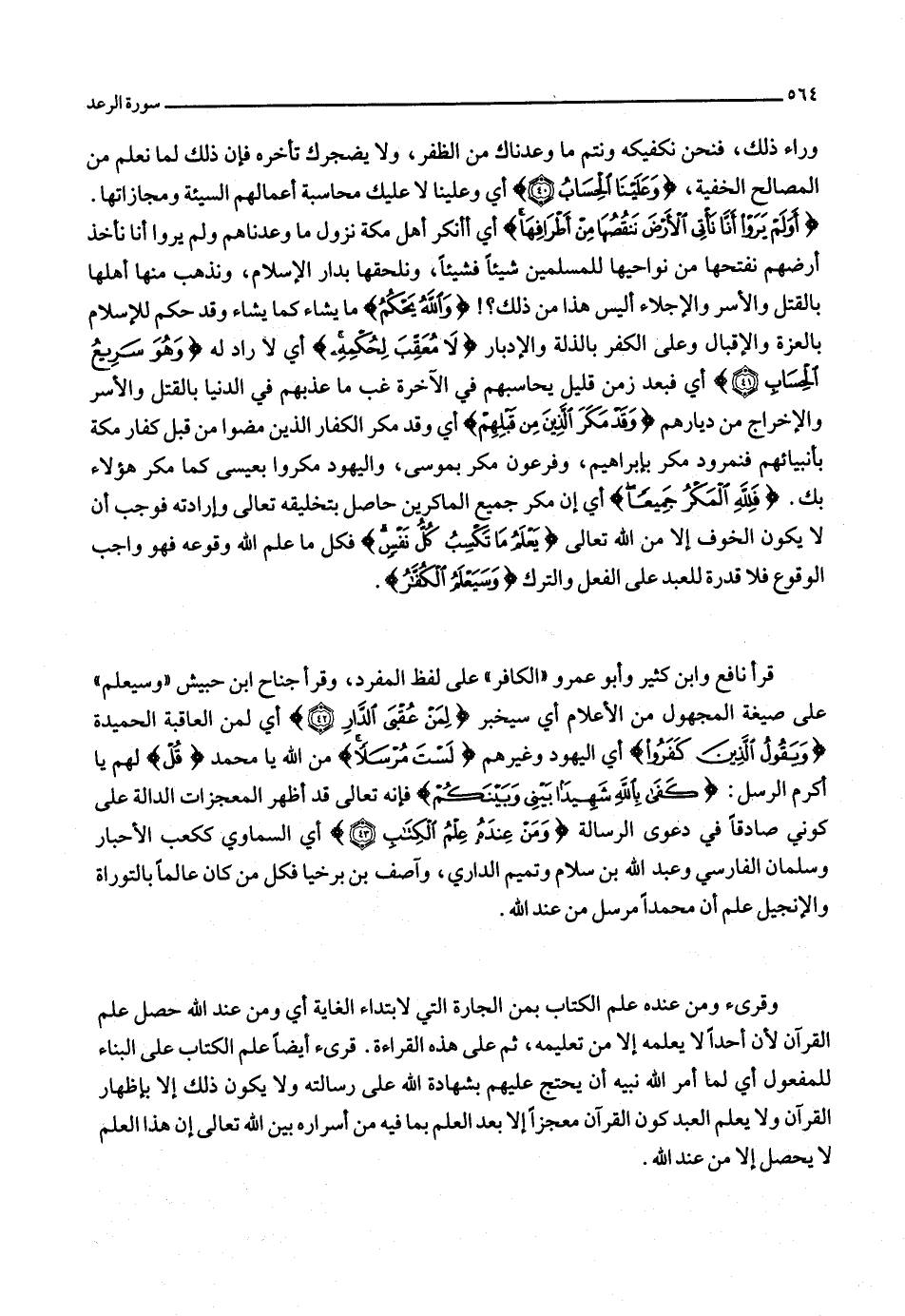 قرأ نافع وابن كثير وأبو عمرو «الكافر» على لفظ المفرد، وقرأ جناح ابن حبيش «وسيعلم» على صيغة المجهول من الأعلام أي سيخبر لِمَنْ عُقْبَى الدَّارِ (42) أي لمن العاقبة الحميدة وَيَقُولُ الَّذِينَ كَفَرُوا أي اليهود وغيرهم لَسْتَ مُرْسَلًا من الله يا محمد قُلْ لهم يا أكرم الرسل: كَفى بِاللَّهِ شَهِيداً بَيْنِي وَبَيْنَكُمْ فإنه تعالى قد أظهر المعجزات الدالة على كوني صادقا في دعوى الرسالة وَمَنْ عِنْدَهُ عِلْمُ الْكِتابِ (43) أي السماوي ككعب الأحبار وسلمان الفارسي وعبد الله بن سلام وتميم الداري، وآصف بن برخيا فكل من كان عالما بالتوراة والإنجيل علم أن محمدا مرسل من عند الله.