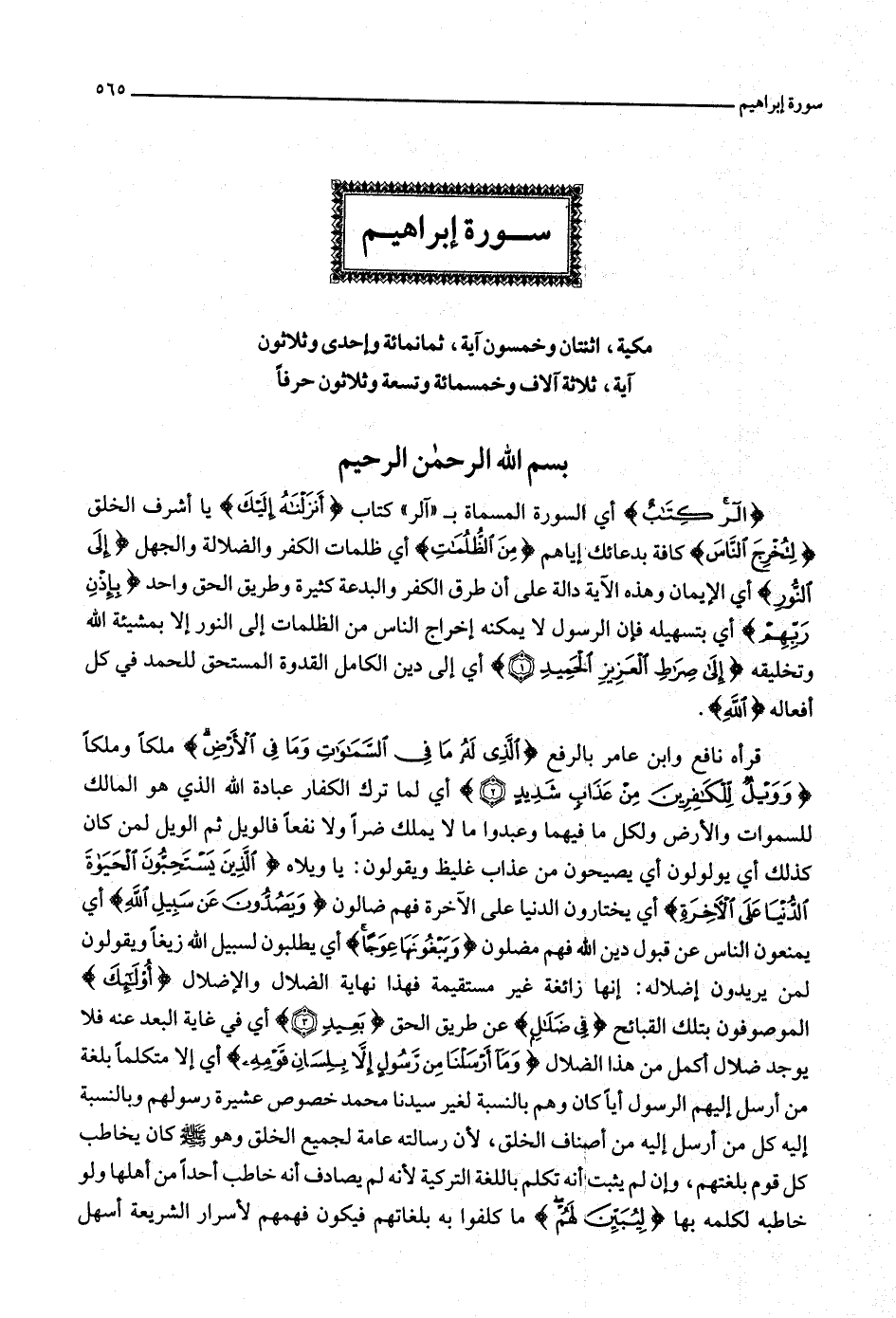 الر كِتابٌ أي السورة المسماة ب «الر» كتاب أَنْزَلْناهُ إِلَيْكَ يا أشرف الخلق لِتُخْرِجَ النَّاسَ كافة بدعائك إياهم مِنَ الظُّلُماتِ أي ظلمات الكفر والضلالة والجهل إِلَى النُّورِ أي الإيمان وهذه الآية دالة على أن طرق الكفر والبدعة كثيرة وطريق الحق واحد بِإِذْنِ رَبِّهِمْ أي بتسهيله فإن الرسول لا يمكنه إخراج الناس من الظلمات إلى النور إلا بمشيئة الله وتخليقه إِلى صِراطِ الْعَزِيزِ الْحَمِيدِ (1) أي إلى دين الكامل القدوة المستحق للحمد في كل أفعاله اللَّهِ.
