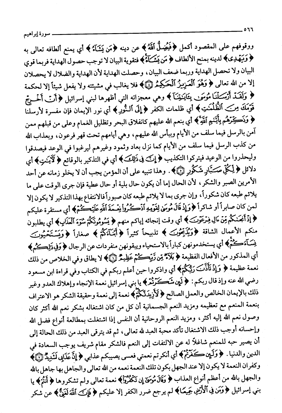 ووقوفهم على المقصود أكمل فَيُضِلُّ اللَّهُ عن دينه مَنْ يَشاءُ أي يمنع ألطافه تعالى به وَيَهْدِي لدينه بمنح الألطاف مَنْ يَشاءُ فتقوية البيان لا توجب حصول الهداية فربما قوي البيان ولا تحصل الهداية وربما ضعف البيان، وحصلت الهداية لأن الهداية والضلال لا يحصلان إلا من الله تعالى وَهُوَ الْعَزِيزُ الْحَكِيمُ (4) فلا يغالب في مشيئته ولا يفعل شيئا إلا لحكمة وَلَقَدْ أَرْسَلْنا مُوسى بِآياتِنا وهي معجزاته التي أظهرها لبني إسرائيل أَنْ أَخْرِجْ قَوْمَكَ مِنَ الظُّلُماتِ أي ظلمات الكفر إِلَى النُّورِ أي نور الإيمان فإن مفسرة لأرسلنا وَذَكِّرْهُمْ بِأَيَّامِ اللَّهِ أي بنعم الله عليهم كانفلاق البحر وتظليل الغمام وعلى من قبلهم ممن آمن بالرسل فيما سلف من الأيام وببأس الله عليهم، وهي أيامهم تحت قهر فرعون، وبعذاب الله من كذب الرسل فيما سلف من الأيام كما نزل بعاد وثمود وغيرهم ليرغبوا في الوعد فيصدقوا وليحذروا من الوعيد فيتركوا التكذيب إِنَّ فِي ذلِكَ أي في التذكير بالوقائع لَآياتٍ أي دلائل لِكُلِّ صَبَّارٍ شَكُورٍ (5) . وهذا تنبيه على أن المؤمن يجب أن لا يخلو زمانه عن أحد الأمرين الصبر والشكر، لأن الحال إما أن يكون حال بلية أو حال عطية فإن جرى الوقت على ما يلائم طبعه كان شكورا، وإن جرى بما لا يلائم طبعه كان صبورا فالانتفاع بهذا التذكير لا يكون إلا لمن كان صابرا أو شاكرا وَإِذْ قالَ مُوسى لِقَوْمِهِ اذْكُرُوا نِعْمَةَ اللَّهِ عَلَيْكُمْ أي مستقرة عليكم إِذْ أَنْجاكُمْ مِنْ آلِ فِرْعَوْنَ أي وقت إنجائه إياكم منهم يَسُومُونَكُمْ سُوءَ الْعَذابِ أي يطلبون منكم الأعمال الشاقة وَيُذَبِّحُونَ تذبيحا كثيرا أَبْناءَكُمْ صغارا وَيَسْتَحْيُونَ نِساءَكُمْ أي يستخدمونهن كبارا بالاستحياء ويبقونهن منفردات عن الرجال وَفِي ذلِكُمْ أي المذكور من الأفعال الفظيعة بَلاءٌ مِنْ رَبِّكُمْ عَظِيمٌ (6) لا يطاق وفي الخلاص من ذلك نعمة عظيمة وَإِذْ تَأَذَّنَ رَبُّكُمْ أي واذكروا حين أعلم ربكم في الكتاب وفي قراءة ابن مسعود رضي الله عنه وإذ قال ربكم: لَئِنْ شَكَرْتُمْ يا بني إسرائيل نعمة الإنجاء وإهلاك العدو وغير ذلك بالإيمان الخالص والعمل الصالح لَأَزِيدَنَّكُمْ نعمة إلى نعمة وحقيقة الشكر هو الاعتراف بنعمة المنعم مع تعظيمه ومزيد النعم الجسمانية أن كل من كان اشتغاله بشكر نعم الله أكثر كان وصول نعم الله إليه أكثر، ومزيد النعم الروحانية أن النفس إذا اشتغلت بمطالعة أنواع فضل الله وإحسانه أوجب ذلك الاشتغال تأكد محبة العبد لله تعالى، ثم قد يترقى العبد من ذلك الحالة إلى أن يصير حبه للمنعم شاغلا له عن الالتفات إلى النعم فالشكر مقام شريف يوجب السعادة في الدين والدنيا. وَلَئِنْ كَفَرْتُمْ أي أنكرتم نعمتي فعسى يصيبكم عذابي إِنَّ عَذابِي لَشَدِيدٌ (7) وكفران النعمة لا يكون إلا عند الجهل بكون تلك النعمة نعمه من الله تعالى والجاهل بها جاهل بالله والجهل بالله من أعظم أنواع العذاب وَقالَ مُوسى إِنْ تَكْفُرُوا نعمة تعالى ولم تشكروها أَنْتُمْ يا بني إسرائيل وَمَنْ فِي الْأَرْضِ جَمِيعاً لم يرجع