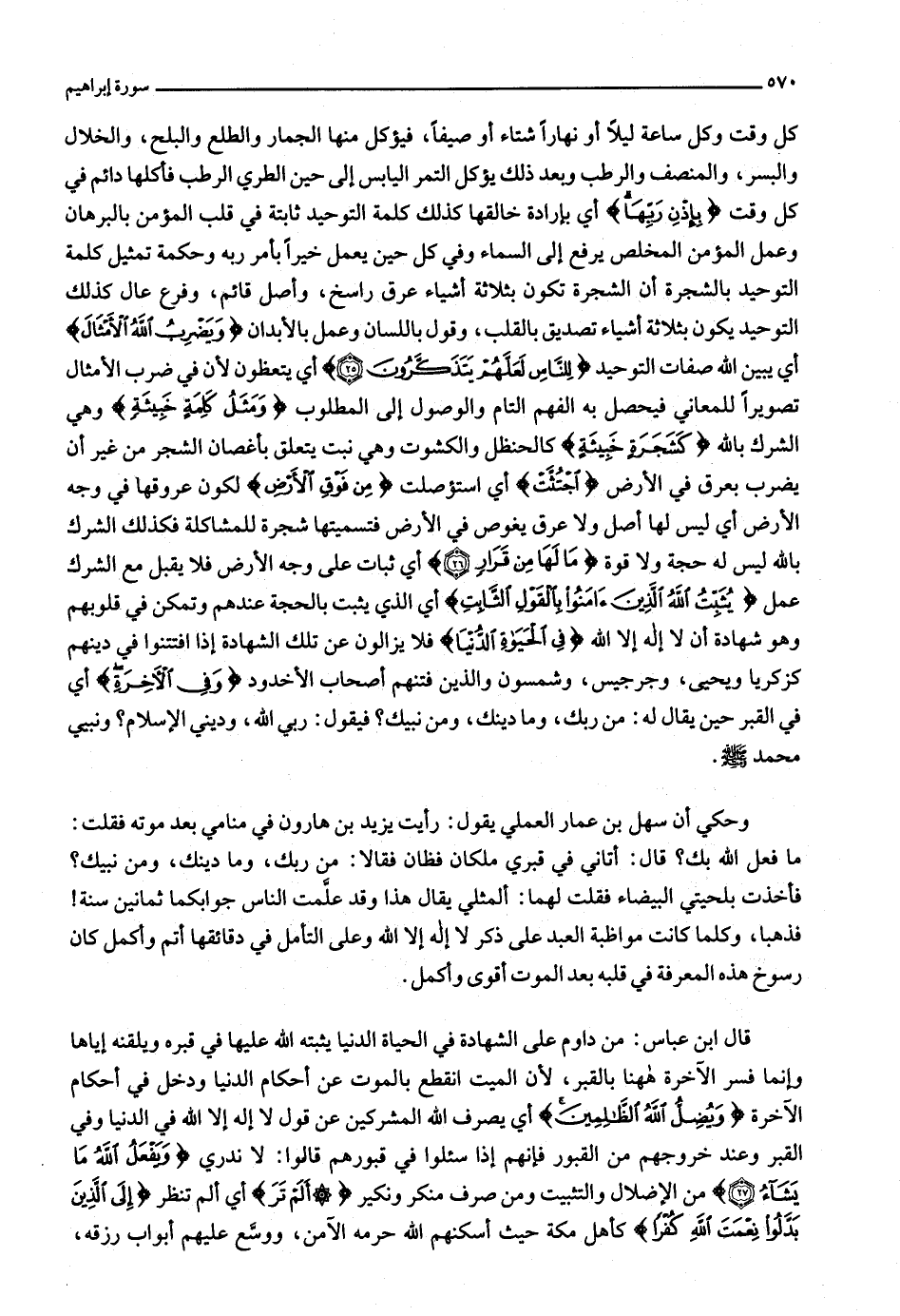 كل وقت وكل ساعة ليلا أو نهارا شتاء أو صيفا، فيؤكل منها الجمار والطلع والبلح، والخلال والبسر، والمنصف والرطب وبعد ذلك يؤكل التمر اليابس إلى حين الطري الرطب فأكلها دائم في كل وقت بِإِذْنِ رَبِّها أي بإرادة خالقها كذلك كلمة التوحيد ثابتة في قلب المؤمن بالبرهان وعمل المؤمن المخلص يرفع إلى السماء وفي كل حين يعمل خيرا بأمر ربه وحكمة تمثيل كلمة التوحيد بالشجرة أن الشجرة تكون بثلاثة أشياء عرق راسخ، وأصل قائم، وفرع عال كذلك التوحيد يكون بثلاثة أشياء تصديق بالقلب، وقول باللسان وعمل بالأبدان وَيَضْرِبُ اللَّهُ الْأَمْثالَ أي يبين الله صفات التوحيد لِلنَّاسِ لَعَلَّهُمْ يَتَذَكَّرُونَ (25) أي يتعظون لأن في ضرب الأمثال تصويرا للمعاني فيحصل به الفهم التام والوصول إلى المطلوب وَمَثَلُ كَلِمَةٍ خَبِيثَةٍ وهي الشرك بالله كَشَجَرَةٍ خَبِيثَةٍ كالحنظل والكشوت وهي نبت يتعلق بأغصان الشجر من غير أن يضرب بعرق في الأرض اجْتُثَّتْ أي استؤصلت مِنْ فَوْقِ الْأَرْضِ لكون عروقها في وجه الأرض أي ليس لها أصل ولا عرق يغوص في الأرض فتسميتها شجرة للمشاكلة فكذلك الشرك بالله ليس له حجة ولا قوة ما لَها مِنْ قَرارٍ (26) أي ثبات على وجه الأرض فلا يقبل مع الشرك عمل يُثَبِّتُ اللَّهُ الَّذِينَ آمَنُوا بِالْقَوْلِ الثَّابِتِ أي الذي