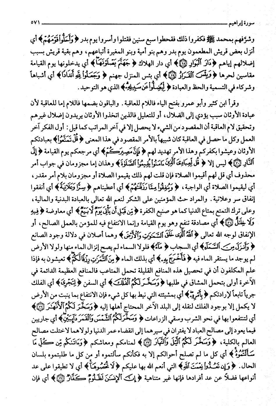 قُلْ لِعِبادِيَ الَّذِينَ آمَنُوا يُقِيمُوا الصَّلاةَ وهذان إما مجزومان في جواب أمر محذوف أي قل لهم أقيموا الصلاة فإن قلت لهم ذلك يقيموا الصلاة أو مجزومان بلام أمر مقدر، أي ليقيموا الصلاة أي الواجبة، وَيُنْفِقُوا مِمَّا رَزَقْناهُمْ أي أعطيناهم سِرًّا وَعَلانِيَةً أي أنفقوا إنفاق سر وعلانية. والمراد حث المؤمنين على الشكر لنعم الله تعالى بالعبادة البدنية والمالية، وعلى ترك التمتع بمتاع الدنيا كما هو صنيع الكفرة مِنْ قَبْلِ أَنْ يَأْتِيَ يَوْمٌ لا بَيْعٌ أي معاوضة فِيهِ وَلا خِلالٌ (31) أي مصادقة تنفع وهو يوم القيامة وإنما الانتفاع فيه للمؤمن بالعمل الصالح، أو الإنفاق لوجه الله تعالى اللَّهُ الَّذِي خَلَقَ السَّماواتِ وَالْأَرْضَ وهما أصلان في دلالة وجود الصانع وَأَنْزَلَ مِنَ السَّماءِ أي السحاب ماءً فلولا السماء لم يصح إنزال الماء منها ولولا الأرض لم يوجد ما يستقر الماء فيه فَأَخْرَجَ بِهِ أي بذلك الماء مِنَ الثَّمَراتِ رِزْقاً لَكُمْ تعيشون به فإذا علم المكلفون أن في تحصيل هذه المنافع القليلة تحمل المتاعب فالمنافع العظيمة الدائمة في الآخرة أولى بتحمل المشاق في طلبها وَسَخَّرَ لَكُمُ الْفُلْكَ أي السفن لِتَجْرِيَ أي الفلك جريا تابعا لإرادتكم بِأَمْرِهِ أي بمشيئته التي نيط بها كل شيء فإن الانتفاع بما ينبت من الأرض لا يكمل إلا بوجود الفلك لنقله إلى البلد الآخر المحتاج أهلها إليه وَسَخَّرَ لَكُمُ الْأَنْهارَ (32) أي لتنتفعوا بها في نحو الشرب وسقي الزراعات وَسَخَّرَ لَكُمُ الشَّمْسَ وَالْقَمَرَ دائِبَيْنِ أي جاريين فيما يعود إلى مصالح العباد لا يفتران في سيرهما إلى انقضاء عمر الدنيا ولولاهما لاختلت مصالح العالم بالكلية، وَسَخَّرَ لَكُمُ اللَّيْلَ وَالنَّهارَ (33) لمنامكم ومعاشكم وَآتاكُمْ مِنْ كُلِّ ما سَأَلْتُمُوهُ أي كل ما لم تصلح أحوالكم إلا به فكأنكم سألتموه أو من كل ما طلبتموه بلسان الحال. وَإِنْ تَعُدُّوا نِعْمَتَ اللَّهِ التي أنعم الله بها عليكم لا تُحْصُوها أي لا تطيقوا على عد أنواعها فضلا عن عد أفرادها فإنها غير متناهية إِنَّ الْإِنْسانَ لَظَلُومٌ كَفَّارٌ (34) أي فإن