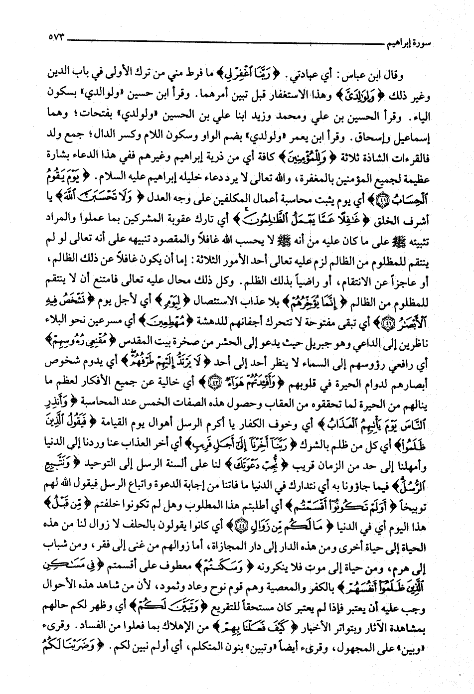 أن لا ينتقم للمظلوم من الظالم إِنَّما يُؤَخِّرُهُمْ بلا عذاب الاستئصال لِيَوْمٍ أي لأجل يوم تَشْخَصُ فِيهِ الْأَبْصارُ (42) أي تبقى مفتوحة لا تتحرك أجفانهم للدهشة مُهْطِعِينَ أي مسرعين نحو البلاء ناظرين إلى الداعي وهو جبريل حيث يدعو إلى الحشر من صخرة بيت المقدس مُقْنِعِي رُؤُسِهِمْ أي رافعي رؤوسهم إلى السماء لا ينظر أحد إلى أحد لا يَرْتَدُّ إِلَيْهِمْ طَرْفُهُمْ أي يدوم شخوص أبصارهم لدوام الحيرة في قلوبهم وَأَفْئِدَتُهُمْ هَواءٌ (43) أي خالية عن جميع الأفكار لعظم ما ينالهم من الحيرة لما تحققوه من العقاب وحصول هذه الصفات الخمس عند المحاسبة وَأَنْذِرِ النَّاسَ يَوْمَ يَأْتِيهِمُ الْعَذابُ أي وخوف الكفار يا أكرم الرسل أهوال يوم القيامة فَيَقُولُ الَّذِينَ ظَلَمُوا أي كل من ظلم بالشرك رَبَّنا أَخِّرْنا إِلى أَجَلٍ قَرِيبٍ أي أخر العذاب عنا وردنا إلى الدنيا وأمهلنا إلى حد من الزمان قريب نُجِبْ دَعْوَتَكَ لنا على ألسنة الرسل إلى التوحيد وَنَتَّبِعِ الرُّسُلَ فيما جاءونا به أي نتدارك في الدنيا ما فاتنا من إجابة الدعوة واتباع الرسل فيقول الله لهم توبيخا أَوَلَمْ تَكُونُوا أَقْسَمْتُمْ أي أطلبتم هذا المطلوب وهل لم تكونوا خلفتم مِنْ قَبْلُ هذا اليوم أي في الدنيا ما لَكُمْ مِنْ زَوالٍ (44) أي كانوا يقولون بالحلف لا زوال لنا من هذه الحياة إلى حياة أخرى ومن هذه الدار إلى دار المجازاة، أما زوالهم من غنى إلى فقر، ومن شباب إلى هرم، ومن حياة إلى موت فلا ينكرونه وَسَكَنْتُمْ معطوف على أقسمتم فِي مَساكِنِ الَّذِينَ ظَلَمُوا أَنْفُسَهُمْ بالكفر والمعصية وهم قوم نوح وعاد وثمود، لأن من شاهد هذه الأحوال وجب عليه أن يعتبر فإذا لم يعتبر كان مستحقا للتقريع وَتَبَيَّنَ لَكُمْ أي وظهر لكم حالهم بمشاهدة الآثار وبتواتر الأخبار كَيْفَ فَعَلْنا بِهِمْ من الإهلاك بما فعلوا من الفساد. وقرئ «وبين» على المجهول، وقرئ أيضا «وتبين» بنون المتكلم، أي أولم نبين لكم. وَضَرَبْنا لَكُمُ
