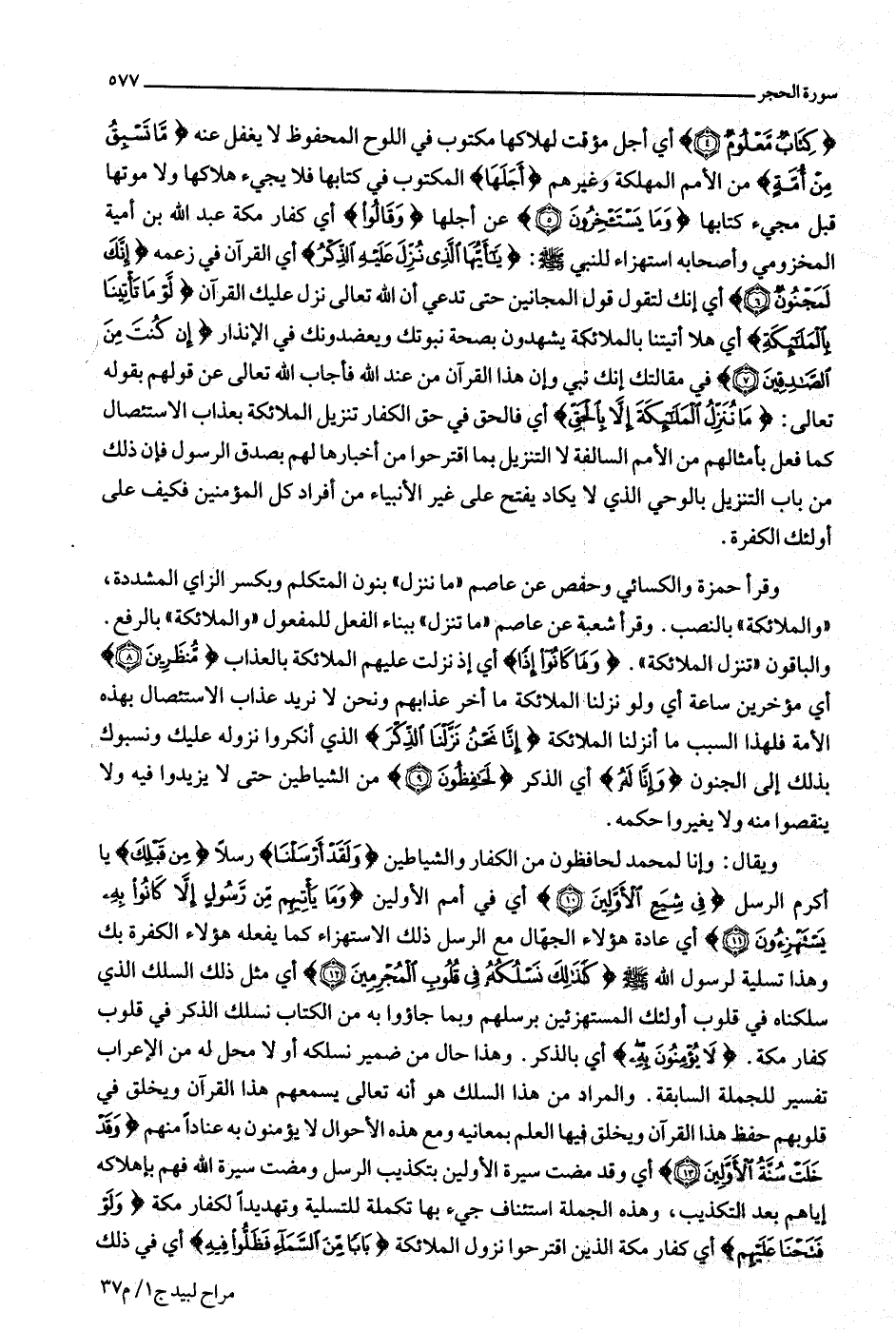 كِتابٌ مَعْلُومٌ (4) أي أجل مؤقت لهلاكها مكتوب في اللوح المحفوظ لا يغفل عنه ما تَسْبِقُ مِنْ أُمَّةٍ من الأمم المهلكة وغيرهم أَجَلَها المكتوب في كتابها فلا يجيء هلاكها ولا موتها قبل مجيء كتابها وَما يَسْتَأْخِرُونَ (5) عن أجلها وَقالُوا أي كفار مكة عبد الله بن أمية المخزومي وأصحابه استهزاء للنبي صلّى الله عليه وسلّم: يا أَيُّهَا الَّذِي نُزِّلَ عَلَيْهِ الذِّكْرُ أي القرآن في زعمه إِنَّكَ لَمَجْنُونٌ (6) أي إنك لتقول قول المجانين حتى تدعي أن الله تعالى نزل عليك القرآن لَوْ ما تَأْتِينا بِالْمَلائِكَةِ أي هلا أتيتنا بالملائكة يشهدون بصحة نبوتك ويعضدونك في الإنذار إِنْ كُنْتَ مِنَ الصَّادِقِينَ (7) في مقالتك إنك نبي وإن هذا القرآن من عند الله فأجاب الله تعالى عن قولهم بقوله تعالى: ما نُنَزِّلُ الْمَلائِكَةَ إِلَّا بِالْحَقِّ أي فالحق في حق الكفار تنزيل الملائكة بعذاب الاستئصال كما فعل بأمثالهم من الأمم السالفة لا التنزيل بما اقترحوا من أخبارها لهم بصدق الرسول فإن ذلك من باب التنزيل بالوحي الذي لا يكاد يفتح على غير الأنبياء من أفراد كل المؤمنين فكيف على أولئك الكفرة.