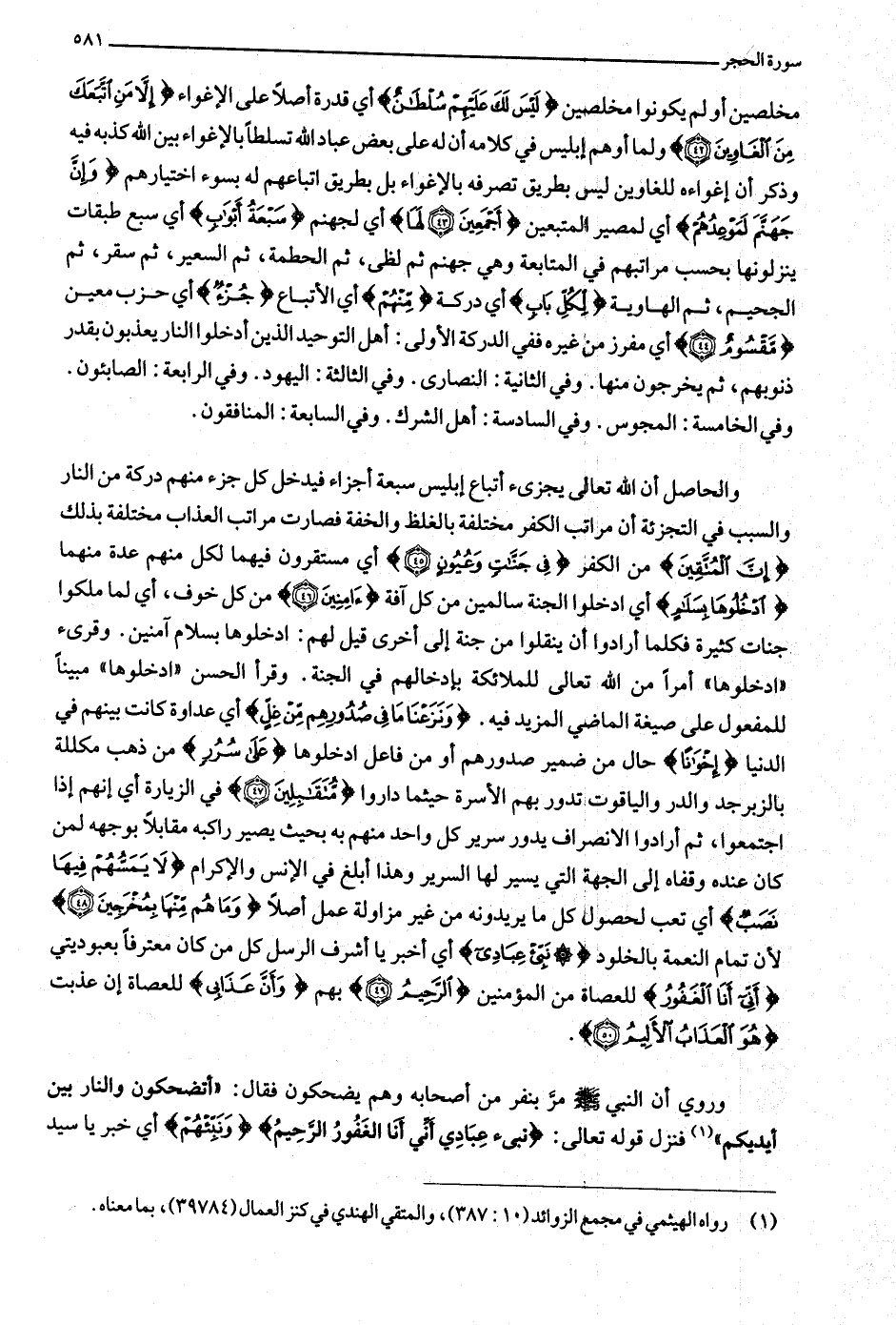 مخلصين أو لم يكونوا مخلصين لَيْسَ لَكَ عَلَيْهِمْ سُلْطانٌ أي قدرة أصلا على الإغواء إِلَّا مَنِ اتَّبَعَكَ مِنَ الْغاوِينَ (42) ولما أوهم إبليس في كلامه أن له على بعض عباد الله تسلطا بالإغواء بين الله كذبه فيه وذكر أن إغواءه للغاوين ليس بطريق تصرفه بالإغواء بل بطريق اتباعهم له بسوء اختيارهم وَإِنَّ جَهَنَّمَ لَمَوْعِدُهُمْ أي لمصير المتبعين أَجْمَعِينَ (43) لَها أي لجهنم سَبْعَةُ أَبْوابٍ أي سبع طبقات ينزلونها بحسب مراتبهم في المتابعة وهي جهنم ثم لظى، ثم الحطمة، ثم السعير، ثم سقر، ثم الجحيم، ثم الهاوية لِكُلِّ بابٍ أي دركة مِنْهُمْ أي الأتباع جُزْءٌ أي حزب معين مَقْسُومٌ (44) أي مفرز من غيره ففي الدركة الأولى: أهل التوحيد الذين أدخلوا النار يعذبون بقدر ذنوبهم، ثم يخرجون منها. وفي الثانية: النصارى. وفي الثالثة: اليهود. وفي الرابعة: الصابئون.