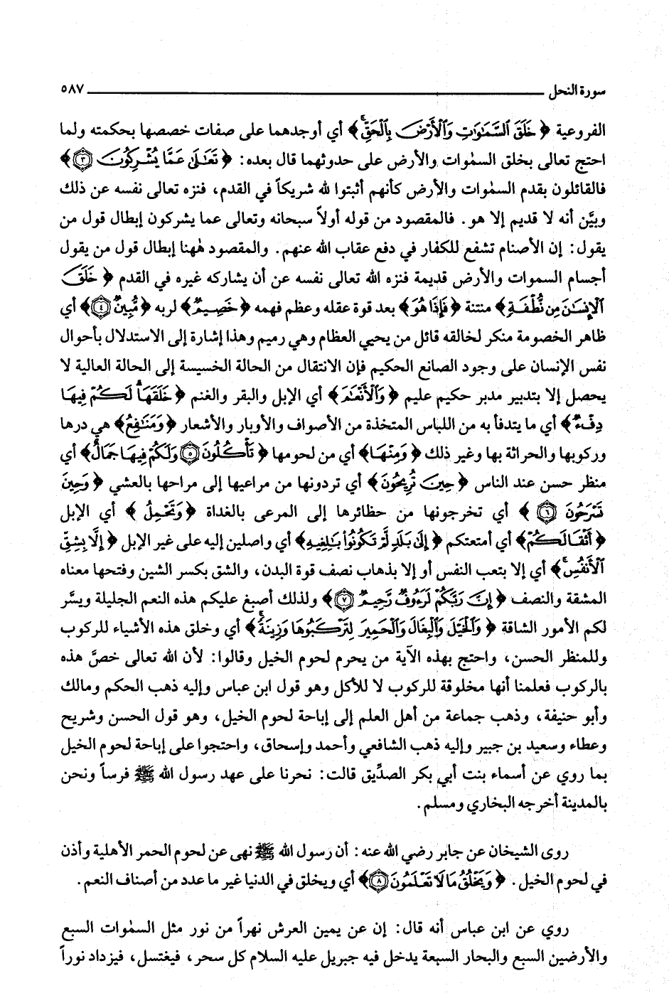 الفروعية خَلَقَ السَّماواتِ وَالْأَرْضَ بِالْحَقِّ أي أوجدهما على صفات خصصها بحكمته ولما احتج تعالى بخلق السموات والأرض على حدوثهما قال بعده: تَعالى عَمَّا يُشْرِكُونَ (3) فالقائلون بقدم السموات والأرض كأنهم أثبتوا لله شريكا في القدم، فنزه تعالى نفسه عن ذلك وبيّن أنه لا قديم إلا هو. فالمقصود من قوله أولا سبحانه وتعالى عما يشركون إبطال قول من يقول: إن الأصنام تشفع للكفار في دفع عقاب الله عنهم. والمقصود هاهنا إبطال قول من يقول أجسام السموات والأرض قديمة فنزه الله تعالى نفسه عن أن يشاركه غيره في القدم خَلَقَ الْإِنْسانَ مِنْ نُطْفَةٍ منتنة فَإِذا هُوَ بعد قوة عقله وعظم فهمه خَصِيمٌ لربه مُبِينٌ (4) أي ظاهر الخصومة منكر لخالقه قائل من يحيي العظام وهي رميم وهذا إشارة إلى الاستدلال بأحوال نفس الإنسان على وجود الصانع الحكيم فإن الانتقال من الحالة الخسيسة إلى الحالة العالية لا يحصل إلا بتدبير مدبر حكيم عليم وَالْأَنْعامَ أي الإبل والبقر والغنم خَلَقَها لَكُمْ فِيها دِفْءٌ أي ما يتدفأ به من اللباس المتخذة من الأصواف والأوبار والأشعار وَمَنافِعُ هي درها وركوبها والحراثة بها وغير ذلك وَمِنْها أي من لحومها تَأْكُلُونَ (5) وَلَكُمْ فِيها جَمالٌ أي منظر حسن عند الناس حِينَ تُرِيحُونَ أي تردونها من مراعيها إلى مراحها بالعشي وَحِينَ تَسْرَحُونَ (6) أي تخرجونها من حظائرها إلى المرعى بالغداة وَتَحْمِلُ أي الإبل أَثْقالَكُمْ أي أمتعتكم إِلى بَلَدٍ لَمْ تَكُونُوا بالِغِيهِ أي واصلين إليه على غير الإبل إِلَّا بِشِقِّ الْأَنْفُسِ أي إلا بتعب النفس أو إلا بذهاب نصف قوة البدن، والشق بكسر الشين وفتحها معناه المشقة والنصف إِنَّ رَبَّكُمْ لَرَؤُفٌ رَحِيمٌ (7) ولذلك أصبغ عليكم هذه النعم الجليلة ويسّر لكم الأمور الشاقة وَالْخَيْلَ وَالْبِغالَ وَالْحَمِيرَ لِتَرْكَبُوها وَزِينَةً أي وخلق هذه الأشياء للركوب وللمنظر الحسن، واحتج بهذه الآية من يحرم لحوم الخيل وقالوا: لأن الله تعالى خصّ هذه بالركوب فعلمنا أنها مخلوقة للركوب لا للأكل وهو قول ابن عباس وإليه ذهب الحكم ومالك وأبو حنيفة، وذهب جماعة من أهل العلم إلى إباحة لحوم الخيل، وهو قول الحسن وشريح وعطاء وسعيد بن جبير وإليه ذهب الشافعي وأحمد وإسحاق، واحتجوا على إباحة لحوم الخيل بما روي عن أسماء بنت أبي بكر الصدّيق قالت: نحرنا على عهد رسول الله صلّى الله عليه وسلّم فرسا ونحن بالمدينة أخرجه البخاري ومسلم.