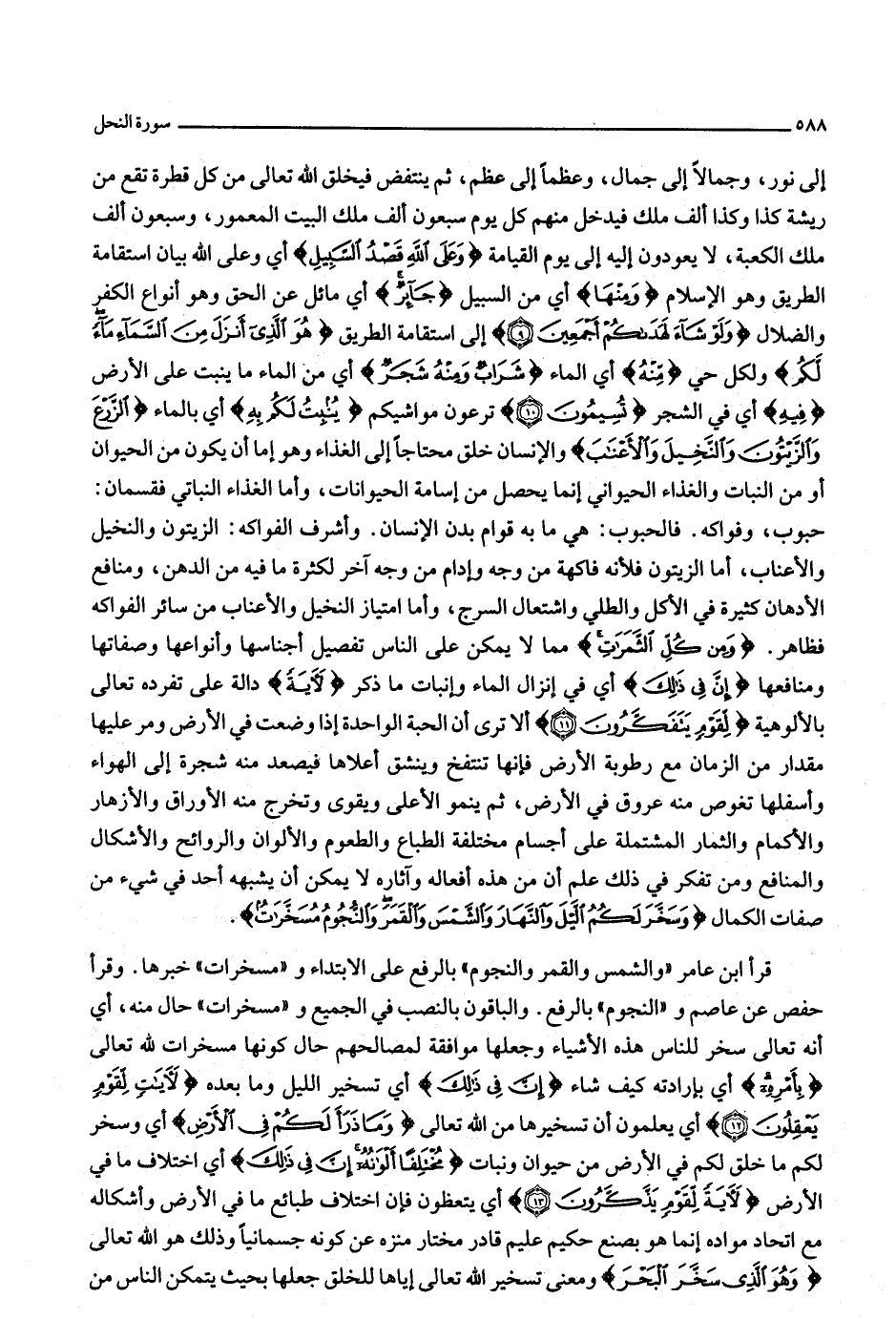 قرأ ابن عامر «والشمس والقمر والنجوم» بالرفع على الابتداء و «مسخرات» خبرها. وقرأ حفص عن عاصم و «النجوم» بالرفع. والباقون بالنصب في الجميع و «مسخرات» حال منه، أي أنه تعالى سخر للناس هذه الأشياء وجعلها موافقة لمصالحهم حال كونها مسخرات لله تعالى بِأَمْرِهِ أي بإرادته كيف شاء إِنَّ فِي ذلِكَ أي تسخير الليل وما بعده لَآياتٍ لِقَوْمٍ يَعْقِلُونَ (12) أي يعلمون أن تسخيرها من الله تعالى وَما ذَرَأَ لَكُمْ فِي الْأَرْضِ أي وسخر لكم ما خلق لكم في الأرض من حيوان ونبات مُخْتَلِفاً أَلْوانُهُ إِنَّ فِي ذلِكَ أي اختلاف ما في الأرض لَآيَةً لِقَوْمٍ يَذَّكَّرُونَ (13) أي يتعظون فإن اختلاف طبائع ما في الأرض وأشكاله مع اتحاد مواده إنما هو بصنع حكيم عليم قادر مختار منزه عن كونه جسمانيا وذلك هو الله تعالى وَهُوَ الَّذِي سَخَّرَ الْبَحْرَ ومعنى تسخير الله تعالى إياها للخلق جعلها بحيث يتمكن الناس من