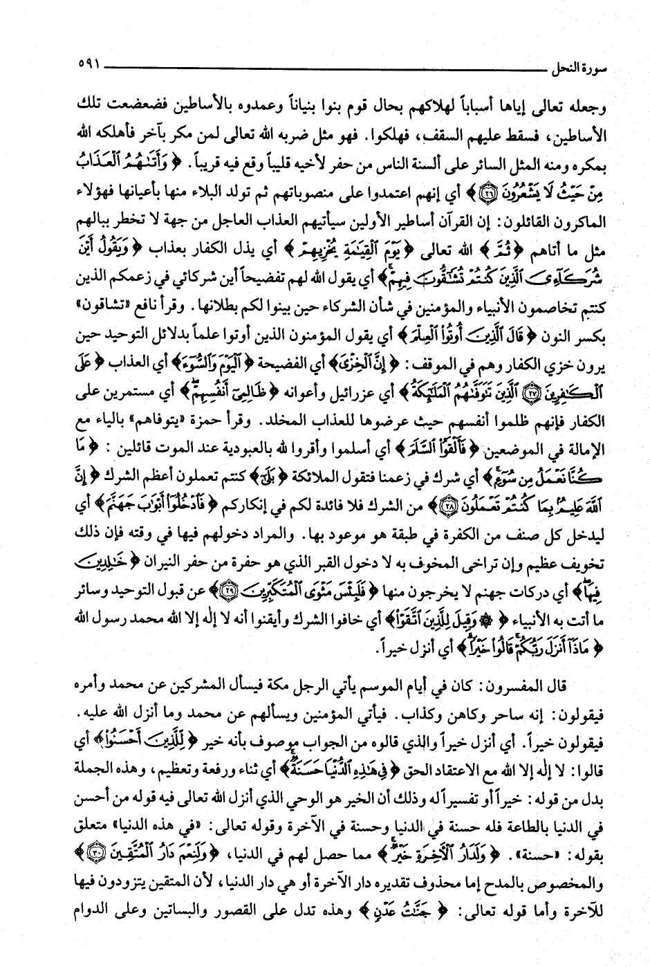 بآخر فأهلكه الله بمكره ومنه المثل السائر على ألسنة الناس من حفر لأخيه قليبا وقع فيه قريبا. وَأَتاهُمُ الْعَذابُ مِنْ حَيْثُ لا يَشْعُرُونَ (26) أي إنهم اعتمدوا على منصوباتهم ثم تولد البلاء منها بأعيانها فهؤلاء الماكرون القائلون: إن القرآن أساطير الأولين سيأتيهم العذاب العاجل من جهة لا تخطر ببالهم مثل ما أتاهم ثُمَّ الله تعالى يَوْمَ الْقِيامَةِ يُخْزِيهِمْ أي يذل الكفار بعذاب وَيَقُولُ أَيْنَ شُرَكائِيَ الَّذِينَ كُنْتُمْ تُشَاقُّونَ فِيهِمْ أي يقول الله لهم تفضيحا أين شركائي في زعمكم الذين كنتم تخاصمون الأنبياء والمؤمنين في شأن الشركاء حين بينوا لكم بطلانها. وقرأ نافع «تشاقون» بكسر النون قالَ الَّذِينَ أُوتُوا الْعِلْمَ أي يقول المؤمنون الذين أوتوا علما بدلائل التوحيد حين يرون خزي الكفار وهم في الموقف: إِنَّ الْخِزْيَ أي الفضيحة الْيَوْمَ وَالسُّوءَ أي العذاب عَلَى الْكافِرِينَ (27) الَّذِينَ تَتَوَفَّاهُمُ الْمَلائِكَةُ أي عزرائيل وأعوانه ظالِمِي أَنْفُسِهِمْ أي مستمرين على الكفار فإنهم ظلموا أنفسهم حيث عرضوها للعذاب المخلد. وقرأ حمزة «يتوفاهم» بالياء مع الإمالة في الموضعين فَأَلْقَوُا السَّلَمَ أي أسلموا وأقروا لله بالعبودية عند الموت قائلين: ما كُنَّا نَعْمَلُ مِنْ سُوءٍ أي شرك في زعمنا فتقول الملائكة بَلى كنتم تعملون أعظم الشرك إِنَّ اللَّهَ عَلِيمٌ بِما كُنْتُمْ تَعْمَلُونَ (28) من الشرك فلا فائدة لكم في إنكاركم فَادْخُلُوا أَبْوابَ جَهَنَّمَ أي ليدخل كل صنف من الكفرة في طبقة هو موعود بها. والمراد دخولهم فيها في وقته فإن ذلك تخويف عظيم وإن تراخى المخوف به لا دخول القبر الذي هو حفرة من حفر النيران خالِدِينَ فِيها أي دركات جهنم لا يخرجون منها فَلَبِئْسَ مَثْوَى الْمُتَكَبِّرِينَ (29) عن قبول التوحيد وسائر ما أتت به الأنبياء وَقِيلَ لِلَّذِينَ اتَّقَوْا أي خافوا الشرك وأيقنوا أنه لا إله إلا الله محمد رسول الله ماذا أَنْزَلَ رَبُّكُمْ قالُوا خَيْراً أي أنزل خيرا.