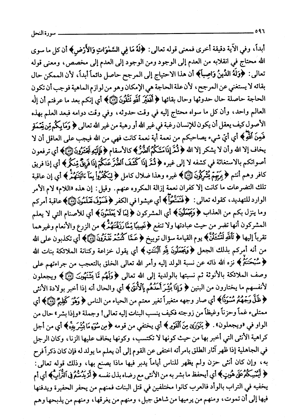 أبدا، وفي الآية دقيقة أخرى فمعنى قوله تعالى: لَهُ ما فِي السَّماواتِ وَالْأَرْضِ أن كل ما سوى الله محتاج في انقلابه من العدم إلى الوجود ومن الوجود إلى العدم إلى مخصص، ومعنى قوله تعالى: وَلَهُ الدِّينُ واصِباً أن هذا الاحتياج إلى المرجح حاصل دائما أبدا، لأن الممكن حال بقائه لا يستغني عن المرجح، لأن علة الحاجة هي الإمكان وهو من لوازم الماهية فوجب أن تكون الحاجة حاصلة حال حدوثها وحال بقائها أَفَغَيْرَ اللَّهِ تَتَّقُونَ (52) أي إنكم بعد ما عرفتم أن إله العالم واحد، وأن كل ما سواه محتاج إليه في وقت حدوثه، وفي وقت دوامه فبعد العلم بهذه الأصول كيف يعقل أن يكون للإنسان رغبة في غير الله أو رهبة من غير الله تعالى وَما بِكُمْ مِنْ نِعْمَةٍ فَمِنَ اللَّهِ أي أيّ شيء يصاحبكم من نعمة أية نعمة كانت فهي من الله فيجب على العاقل أن لا يخاف إلا الله وأن لا يشكر إلا الله ثُمَّ إِذا مَسَّكُمُ الضُّرُّ كالأسقام فَإِلَيْهِ تَجْئَرُونَ (53) أي ترفعون أصواتكم بالاستغاثة في كشفه لا إلى غيره ثُمَّ إِذا كَشَفَ الضُّرَّ عَنْكُمْ إِذا فَرِيقٌ مِنْكُمْ أي إذا فريق كافر وهم أنتم بِرَبِّهِمْ يُشْرِكُونَ (54) غيره وهذا ضلال كامل لِيَكْفُرُوا بِما آتَيْناهُمْ أي إن عاقبة تلك التضرعات ما كانت إلا كفران نعمة إزالة المكروه عنهم. وقيل: إن هذه «اللام» لام الأمر الوارد للتهديد، كقوله تعالى: فَتَمَتَّعُوا أي عيشوا في الكفر فَسَوْفَ تَعْلَمُونَ (55) عاقبة أمركم وما ينزل بكم من العذاب وَيَجْعَلُونَ أي المشركون لِما لا يَعْلَمُونَ أي للأصنام التي لا يعلم المشركون أنها تضر من حيث عبادتها ولا تنفع نَصِيباً مِمَّا رَزَقْناهُمْ من الزرع والأنعام وغيرهما تقربا إليها تَاللَّهِ لَتُسْئَلُنَّ يوم القيامة سؤال توبيخ عَمَّا كُنْتُمْ تَفْتَرُونَ (56) أي تكذبون على الله من أنه أمركم بذلك الجعل وَيَجْعَلُونَ لِلَّهِ الْبَناتِ أي يقول خزاعة وكنانة الملائكة بنات الله سُبْحانَهُ نزه الله ذاته عن نسبة الولد إليه وأمر الله تعالى الخلق بالتعجب من جراءتهم على وصف الملائكة بالأنوثة ثم نسبتها بالولدية إلى الله تعالى وَلَهُمْ ما يَشْتَهُونَ (57) ويجعلون لأنفسهم ما يختارون من البنين وَإِذا بُشِّرَ أَحَدُهُمْ بِالْأُنْثى أي والحال أنه إذا أخبر بولادة الأنثى ظَلَّ وَجْهُهُ مُسْوَدًّا أي صار وجهه متغيرا تغير معتم من الحياء من الناس وَهُوَ كَظِيمٌ (58) أي ممتلئ غما وحزنا وغيظا من زوجته فكيف ينسب البنات إليه تعالى! وجملة «وإذا بشر» حال من الواو في «ويجعلون» . يَتَوارى مِنَ الْقَوْمِ أي يختفي من قومه مِنْ سُوءِ ما بُشِّرَ بِهِ أي من أجل كراهية الأنثى التي أخبر