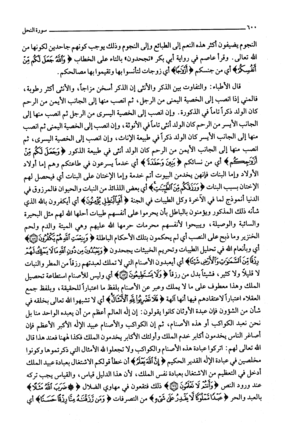 قال الأطباء: والتفاوت بين الذكر والأنثى إن الذكر أسخن مزاجا، والأنثى أكثر رطوبة، فالمني إذا انصب إلى الخصية اليمنى من الرجل، ثم انصب منها إلى الجانب الأيمن من الرحم كان الولد ذكرا تاما في الذكورة. وإن انصب إلى الخصية اليسرى من الرجل ثم انصب منها إلى الجانب الأيسر من الرحم كان الولد أنثى تاما في الأنوثة، وإن انصب إلى الخصية اليمنى ثم انصب منها إلى الجانب الأيسر كان الولد ذكرا في طبيعة الإناث، وإن انصب إلى الخصية اليسرى، ثم انصب منها إلى الجانب الأيمن من الرحم كان الولد أنثى في طبيعة الذكور وَجَعَلَ لَكُمْ مِنْ أَزْواجِكُمْ أي من نسائكم بَنِينَ وَحَفَدَةً أي خدما يسرعون في طاعتكم وهم إما أولاد الأولاد وإما البنات فإنهن يخدمن البيوت أتم خدمة وإما الأختان على البنات أي فيحصل لهم الأختان بسبب البنات وَرَزَقَكُمْ مِنَ الطَّيِّباتِ أي بعض اللذائذ من النبات والحيوان فالمرزوق في الدنيا أنموذج لما في الآخرة وكل الطيبات في الجنة أَفَبِالْباطِلِ يُؤْمِنُونَ أي أيكفرون بالله الذي شأنه ذلك المذكور ويؤمنون بالباطل بأن يحرموا على أنفسهم طيبات أحلها الله لهم مثل البحيرة والسائبة والوصيلة، ويبيحوا لأنفسهم محرمات حرمها الله عليهم وهي الميتة والدم ولحم الخنزير وما ذبح على النصب أي لم يحكمون بتلك الأحكام الباطلة وَبِنِعْمَتِ اللَّهِ هُمْ يَكْفُرُونَ (72) أي وبأنعام الله في تحليل الطيبات وتحريم الخبيثات يجحدون وَيَعْبُدُونَ مِنْ دُونِ اللَّهِ ما لا يَمْلِكُ لَهُمْ رِزْقاً مِنَ السَّماواتِ وَالْأَرْضِ شَيْئاً أي أيعبدون الأصنام التي لا تملك لعبدتهم رزقا من المطر والنبات لا قليلا ولا كثير، فشيئا بدل من رزقا وَلا يَسْتَطِيعُونَ (73) أي وليس للأصنام استطاعة تحصيل الملك وهذا معطوف على ما لا يملك وعبر عن الأصنام بلفظ ما اعتبارا للحقيقة، وبلفظ جمع العقلاء اعتبارا لاعتقادهم فيها أنها آلهة فَلا تَضْرِبُوا لِلَّهِ الْأَمْثالَ أي لا تشبهوا الله تعالى بخلقه في شأن من الشؤون فإن عبدة الأوثان كانوا يقولون: إن إله العالم أعظم من أن يعبده الواحد منا بل نحن نعبد الكواكب أو هذه الأصنام، ثم إن الكواكب والأصنام عبيد الإله الأكبر الأعظم فإن أصاغر الناس يخدمون أكابر خدم الملك وأولئك الأكابر يخدمون الملك فكذا هاهنا فعند هذا قال الله تعالى لهم: اتركوا عبادة هذه الأصنام والكواكب ولا تجعلوا لله الأمثال التي ذكرتموها وكونوا مخلصين في عبادة الإله القدير الحكيم إِنَّ اللَّهَ يَعْلَمُ أن خطأ قولكم الاشتغال بعبادة عبيد الملك أدخل في التعظيم من الاشتغال بعبادة نفس الملك، لأن هذا الدليل قياس، والقياس يجب تركه عند ورود النص وَأَنْتُمْ لا تَعْلَمُونَ (74) ذلك فتقعون في مهاوي الضلال ضَرَبَ اللَّهُ مَثَلًا بالعبد والحر عَبْداً مَمْلُوكاً لا يَقْدِرُ عَلى شَيْءٍ من التصرفات وَمَنْ رَزَقْناهُ مِنَّا رِزْقاً حَسَناً أي