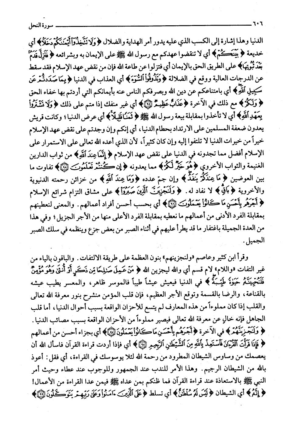 وَلَنَجْزِيَنَّهُمْ في الآخرة أَجْرَهُمْ بِأَحْسَنِ ما كانُوا يَعْمَلُونَ (97) أي بجزاء أحسن من أعمالهم فَإِذا قَرَأْتَ الْقُرْآنَ فَاسْتَعِذْ بِاللَّهِ مِنَ الشَّيْطانِ الرَّجِيمِ (98) أي فإذا أردت قراءة القرآن فاسأل الله أن يعصمك من وساوس الشيطان المطرود من رحمة الله لئلا يوسوسك في القراءة، أي فقل: أعوذ بالله من الشيطان الرجيم. وهذا الأمر للندب عند الجمهور وللوجوب عند عطاء وحيث أمر النبي صلّى الله عليه وسلّم بالاستعاذة عند قراءة القرآن فما ظنكم بمن عداه صلّى الله عليه وسلّم فيمن عدا القراءة من الأعمال! إِنَّهُ أي الشيطان لَيْسَ لَهُ سُلْطانٌ أي تسلط عَلَى الَّذِينَ آمَنُوا وَعَلى رَبِّهِمْ يَتَوَكَّلُونَ (99)