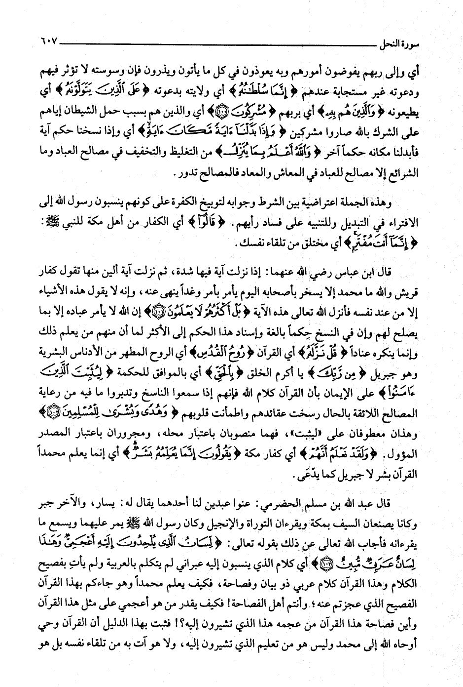 قال عبد الله بن مسلم الحضرمي: عنوا عبدين لنا أحدهما يقال له: يسار، والآخر جبر وكانا يصنعان السيف بمكة ويقرءان التوراة والإنجيل وكان رسول الله صلّى الله عليه وسلّم يمر عليهما ويسمع ما يقرءانه فأجاب الله تعالى عن ذلك بقوله تعالى: لِسانُ الَّذِي يُلْحِدُونَ إِلَيْهِ أَعْجَمِيٌّ وَهذا لِسانٌ عَرَبِيٌّ مُبِينٌ (103) أي كلام الذي ينسبون إليه عبراني لم يتكلم بالعربية ولم يأت بفصيح الكلام وهذا القرآن كلام عربي ذو بيان وفصاحة، فكيف يعلم محمدا وهو جاءكم بهذا القرآن الفصيح الذي عجزتم عنه وأنتم أهل الفصاحة! فكيف يقدر من هو أعجمي على مثل هذا القرآن وأين فصاحة هذا القرآن من عجمه هذا الذي تشيرون إليه؟! فثبت بهذا الدليل أن القرآن وحي أوحاه الله إلى محمد وليس هو من تعليم الذي تشيرون إليه، ولا هو آت به من تلقاء نفسه بل هو