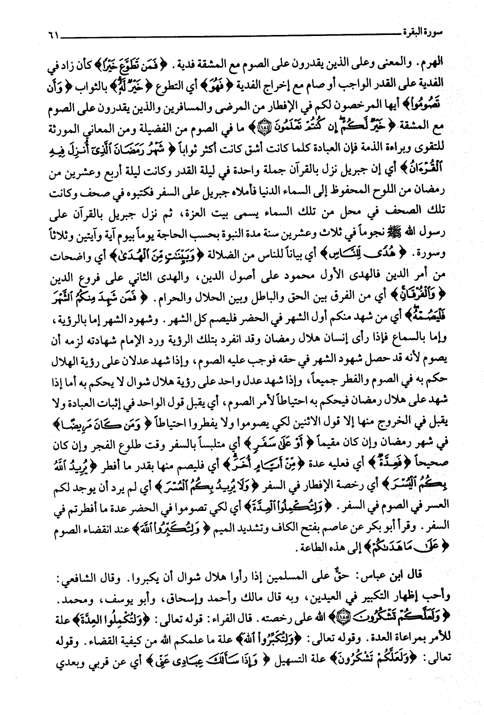 الهرم. والمعنى وعلى الذين يقدرون على الصوم مع المشقة فدية. فَمَنْ تَطَوَّعَ خَيْراً كأن زاد في الفدية على القدر الواجب أو صام مع إخراج الفدية فَهُوَ أي التطوع خَيْرٌ لَهُ بالثواب وَأَنْ تَصُومُوا أيها المرخصون لكم في الإفطار من المرضى والمسافرين والذين يقدرون على الصوم مع المشقة خَيْرٌ لَكُمْ إِنْ كُنْتُمْ تَعْلَمُونَ (184) ما في الصوم من الفضيلة ومن المعاني المورثة للتقوى وبراءة الذمة فإن العبادة كلما كانت أشق كانت أكثر ثوابا شَهْرُ رَمَضانَ الَّذِي أُنْزِلَ فِيهِ الْقُرْآنُ أي إن جبريل نزل بالقرآن جملة واحدة في ليلة القدر وكانت ليلة أربع وعشرين من رمضان من اللوح المحفوظ إلى السماء الدنيا فأملاه جبريل على السفر فكتبوه في صحف وكانت تلك الصحف في محل من تلك السماء يسمى بيت العزة، ثم نزل جبريل بالقرآن على رسول الله صلّى الله عليه وسلّم نجوما في ثلاث وعشرين سنة مدة النبوة بحسب الحاجة يوما بيوم آية وآيتين وثلاثا وسورة. هُدىً لِلنَّاسِ أي بيانا للناس من الضلالة وَبَيِّناتٍ مِنَ الْهُدى أي واضحات من أمر الدين فالهدى الأول محمود على أصول الدين، والهدى الثاني على فروع الدين وَالْفُرْقانِ أي من الفرق بين الحق والباطل وبين الحلال والحرام. فَمَنْ شَهِدَ مِنْكُمُ الشَّهْرَ فَلْيَصُمْهُ أي من شهد منكم أول الشهر في الحضر فليصم كل الشهر. وشهود الشهر إما بالرؤية، وإما بالسماع فإذا رأى إنسان هلال رمضان وقد انفرد بتلك الرؤية ورد الإمام شهادته لزمه أن يصوم لأنه قد حصل شهود الشهر في حقه فوجب عليه الصوم، وإذا شهد عدلان على رؤية الهلال حكم به في الصوم والفطر جميعا، وإذا شهد عدل واحد على رؤية هلال شوال لا يحكم به أما إذا شهد على هلال رمضان فيحكم به احتياطا لأمر الصوم، أي يقبل قول الواحد في إثبات العبادة ولا يقبل في الخروج منها إلا قول الاثنين لكي يصوموا ولا يفطروا احتياطا وَمَنْ كانَ مَرِيضاً في شهر رمضان وإن كان مقيما أَوْ عَلى سَفَرٍ أي متلبسا بالسفر وقت طلوع الفجر وإن كان صحيحا فَعِدَّةٌ أي فعليه عدة مِنْ أَيَّامٍ أُخَرَ أي فليصم منها بقدر ما أفطر يُرِيدُ اللَّهُ بِكُمُ الْيُسْرَ أي رخصة الإفطار في السفر وَلا يُرِيدُ بِكُمُ الْعُسْرَ أي لم يرد أن يوجد لكم العسر في الصوم في السفر. وَلِتُكْمِلُوا الْعِدَّةَ أي لكي تصوموا في الحضر عدة ما أفطرتم في السفر. وقرأ أبو بكر عن عاصم بفتح الكاف وتشديد الميم وَلِتُكَبِّرُوا اللَّهَ عند انقضاء الصوم عَلى ما هَداكُمْ إلى هذه الطاعة.