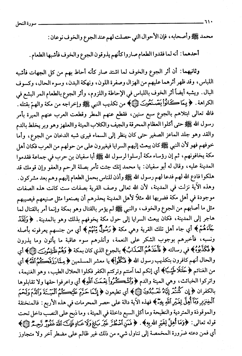 وهذه الآية نزلت في المدينة، لأن الله تعالى وصف القرية بصفات ست كانت هذه الصفات موجودة في أهل مكة فضربها الله مثلا لأهل المدينة يحذرهم أن يصنعوا مثل صنيعهم فيصيبهم مثل ما أصابهم من الجوع والخوف، والنبي صلّى الله عليه وسلّم لم يؤمر بالقتال وهو بمكة وإنما أمر بالقتال لما هاجر إلى المدينة، فكان يبعث السرايا إلى حول مكة يخوفهم بذلك وهو بالمدينة. وَلَقَدْ جاءَهُمْ أي جاء أهل تلك القرية وهي مكة رَسُولٌ مِنْهُمْ أي من جنسهم يعرفونه بأصله ونسبه، فأخبرهم بوجوب الشكر على النعمة، وأنذرهم سوء عاقبة ما يأتون وما يذرون فَكَذَّبُوهُ في رسالته فَأَخَذَهُمُ الْعَذابُ بالجوع الذي كان بمكة وَهُمْ ظالِمُونَ (113) أي والحال أنهم كافرون بتكذيب رسول الله فَكُلُوا يا معشر المسلمين مِمَّا رَزَقَكُمُ اللَّهُ أي من الغنائم حَلالًا طَيِّباً أي إنكم لما آمنتم وتركتم الكفر فكلوا الحلال الطيب، وهو الغنيمة، واتركوا الخبائث، وهي الميتة والدم وَاشْكُرُوا نِعْمَتَ اللَّهِ أي واعرفوا حقها ولا تقابلوها بالكفران إِنْ كُنْتُمْ إِيَّاهُ تَعْبُدُونَ (114) أي تطيعون إِنَّما حَرَّمَ عَلَيْكُمُ الْمَيْتَةَ وَالدَّمَ وَلَحْمَ الْخِنْزِيرِ وَما أُهِلَّ لِغَيْرِ اللَّهِ بِهِ فهذه الآية دالة على حصر المحرمات في هذه الأربع: فالمنخنقة والموقوذة والمتردية والنطيحة وما أكل السبع داخلة في الميتة، وما ذبح على النصب داخل تحت قوله تعالى: وَما أُهِلَّ لِغَيْرِ اللَّهِ بِهِ. فَمَنِ اضْطُرَّ غَيْرَ باغٍ وَلا عادٍ فَإِنَّ اللَّهَ غَفُورٌ رَحِيمٌ (115) أي فمن دعته ضرورة المخمصة إلى تناول شيء من ذلك غير ظالم على مضطر آخر ولا متجاوز