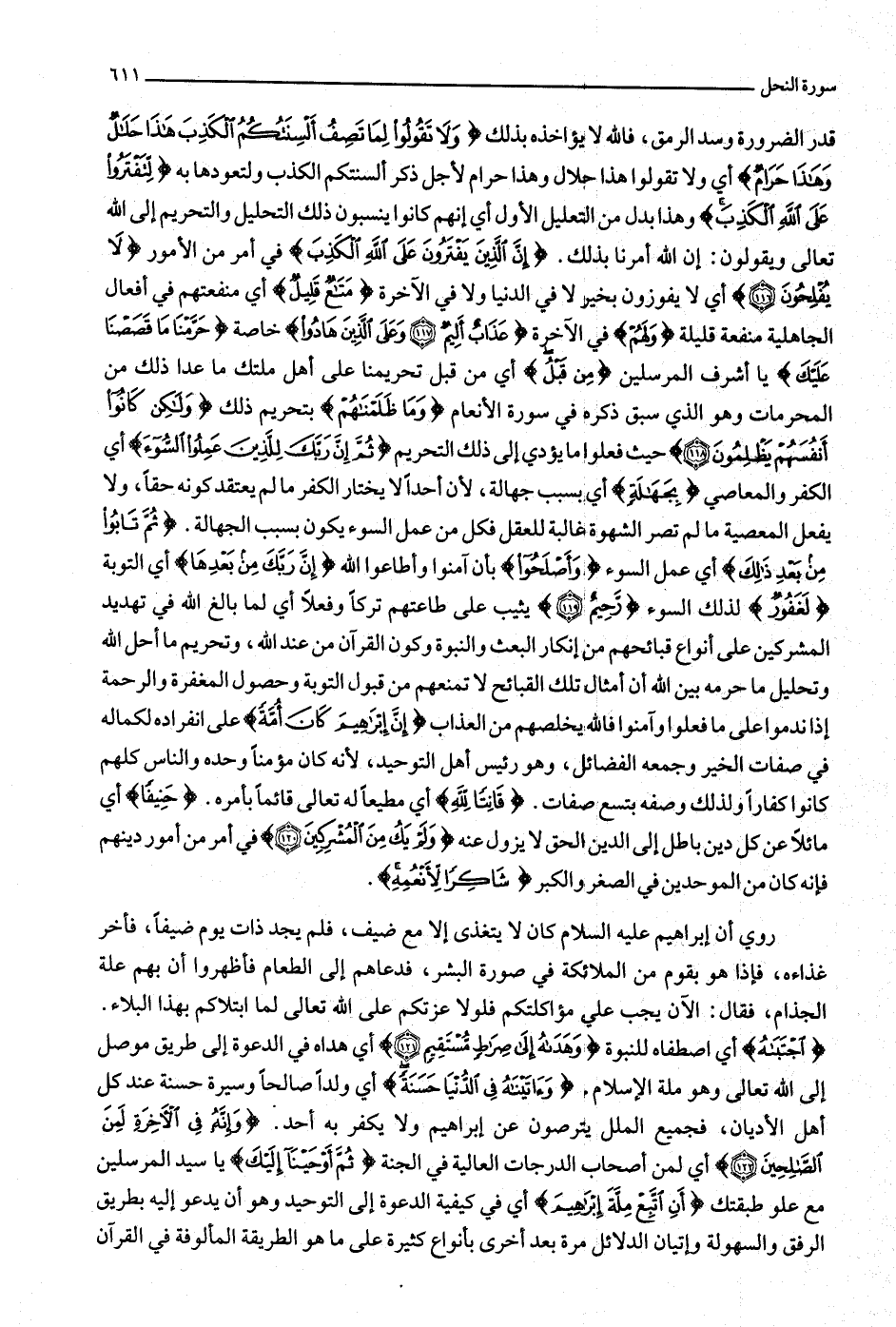 المحرمات وهو الذي سبق ذكره في سورة الأنعام وَما ظَلَمْناهُمْ بتحريم ذلك وَلكِنْ كانُوا أَنْفُسَهُمْ يَظْلِمُونَ (118) حيث فعلوا ما يؤدي إلى ذلك التحريم ثُمَّ إِنَّ رَبَّكَ لِلَّذِينَ عَمِلُوا السُّوءَ أي الكفر والمعاصي بِجَهالَةٍ أي بسبب جهالة، لأن أحدا لا يختار الكفر ما لم يعتقد كونه حقا، ولا يفعل المعصية ما لم تصر الشهوة غالبة للعقل فكل من عمل السوء يكون بسبب الجهالة. ثُمَّ تابُوا مِنْ بَعْدِ ذلِكَ أي عمل السوء وَأَصْلَحُوا بأن آمنوا وأطاعوا الله إِنَّ رَبَّكَ مِنْ بَعْدِها أي التوبة لَغَفُورٌ لذلك السوء رَحِيمٌ (119) يثيب على طاعتهم تركا وفعلا أي لما بالغ الله في تهديد المشركين على أنواع قبائحهم من إنكار البعث والنبوة وكون القرآن من عند الله، وتحريم ما أحل الله وتحليل ما حرمه بين الله أن أمثال تلك القبائح لا تمنعهم من قبول التوبة وحصول المغفرة والرحمة إذا ندموا على ما فعلوا وآمنوا فالله يخلصهم من العذاب إِنَّ إِبْراهِيمَ كانَ أُمَّةً على انفراده لكماله في صفات الخير وجمعه الفضائل، وهو رئيس أهل التوحيد، لأنه كان مؤمنا وحده والناس كلهم كانوا كفارا ولذلك وصفه بتسع صفات. قانِتاً لِلَّهِ أي مطيعا له تعالى قائما بأمره. حَنِيفاً أي مائلا عن كل دين باطل إلى الدين الحق لا يزول عنه وَلَمْ يَكُ مِنَ الْمُشْرِكِينَ (120) في أمر من أمور دينهم فإنه كان من الموحدين في الصغر والكبر
