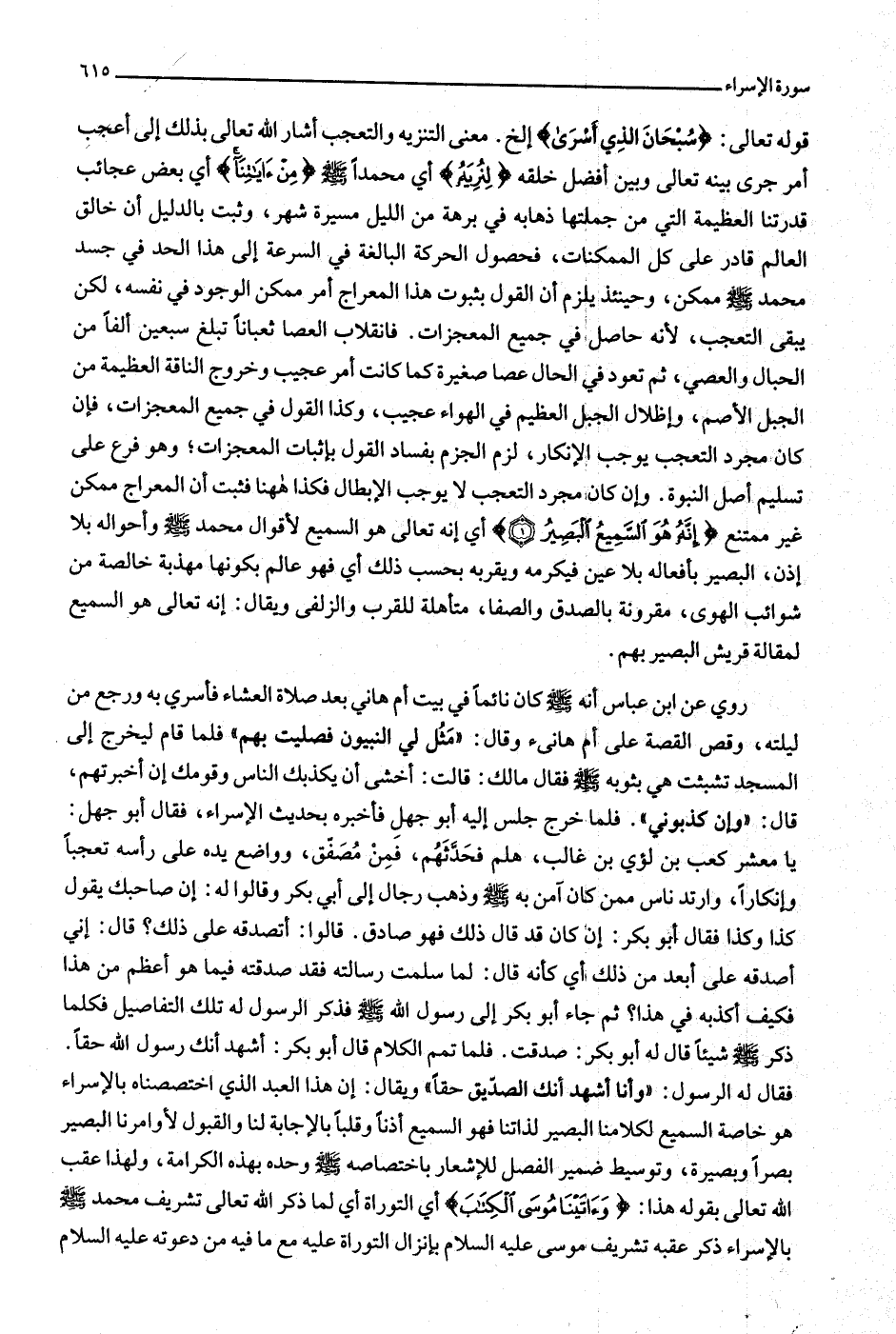 قوله تعالى: سُبْحانَ الَّذِي أَسْرى إلخ. معنى التنزيه والتعجب أشار الله تعالى بذلك إلى أعجب أمر جرى بينه تعالى وبين أفضل خلقه لِنُرِيَهُ أي محمدا صلّى الله عليه وسلّم مِنْ آياتِنا أي بعض عجائب قدرتنا العظيمة التي من جملتها ذهابه في برهة من الليل مسيرة شهر، وثبت بالدليل أن خالق العالم قادر على كل الممكنات، فحصول الحركة البالغة في السرعة إلى هذا الحد في جسد محمد صلّى الله عليه وسلّم ممكن، وحينئذ يلزم أن القول بثبوت هذا المعراج أمر ممكن الوجود في نفسه، لكن يبقى التعجب، لأنه حاصل في جميع المعجزات. فانقلاب العصا ثعبانا تبلغ سبعين ألفا من الحبال والعصي، ثم تعود في الحال عصا صغيرة كما كانت أمر عجيب وخروج الناقة العظيمة من الجبل الأصم، وإظلال الجبل العظيم في الهواء عجيب، وكذا القول في جميع المعجزات، فإن كان مجرد التعجب يوجب الإنكار، لزم الجزم بفساد القول بإثبات المعجزات وهو فرع على تسليم أصل النبوة. وإن كان مجرد التعجب لا يوجب الإبطال فكذا هاهنا فثبت أن المعراج ممكن غير ممتنع إِنَّهُ هُوَ السَّمِيعُ الْبَصِيرُ (1) أي إنه تعالى هو السميع لأقوال محمد صلّى الله عليه وسلّم وأحواله بلا إذن، البصير بأفعاله بلا عين فيكرمه ويقربه بحسب ذلك أي فهو عالم بكونها مهذبة خالصة من شوائب الهوى، مقرونة بالصدق والصفا، متأهلة للقرب والزلفى ويقال: إنه تعالى هو السميع لمقالة قريش البصير بهم.