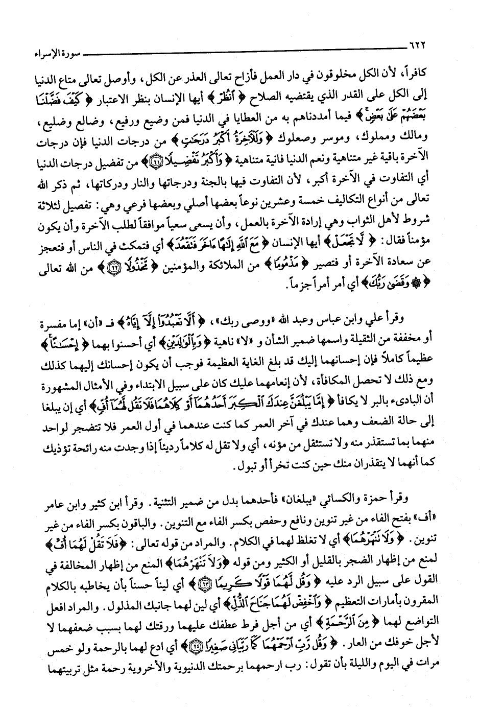 وقرأ علي وابن عباس وعبد الله «ووصى ربك» ، أَلَّا تَعْبُدُوا إِلَّا إِيَّاهُ ف «أن» إما مفسرة أو مخففة من الثقيلة واسمها ضمير الشأن و «لا» ناهية وَبِالْوالِدَيْنِ أي أحسنوا بهما إِحْساناً عظيما كاملا فإن إحسانهما إليك قد بلغ الغاية العظيمة فوجب أن يكون إحسانك إليهما كذلك ومع ذلك لا تحصل المكافأة، لأن إنعامهما عليك كان على سبيل الابتداء وفي الأمثال المشهورة أن البادئ بالبر لا يكافأ إِمَّا يَبْلُغَنَّ عِنْدَكَ الْكِبَرَ أَحَدُهُما أَوْ كِلاهُما فَلا تَقُلْ لَهُما أُفٍّ أي إن يبلغا إلى حالة الضعف وهما عندك في آخر العمر كما كنت عندهما في أول العمر فلا تتضجر لواحد منهما بما تستقذر منه ولا تستثقل من مؤنه، أي ولا تقل له كلاما رديئا إذا وجدت منه رائحة تؤذيك كما أنهما لا يتقذران منك حين كنت تخرأ أو تبول.