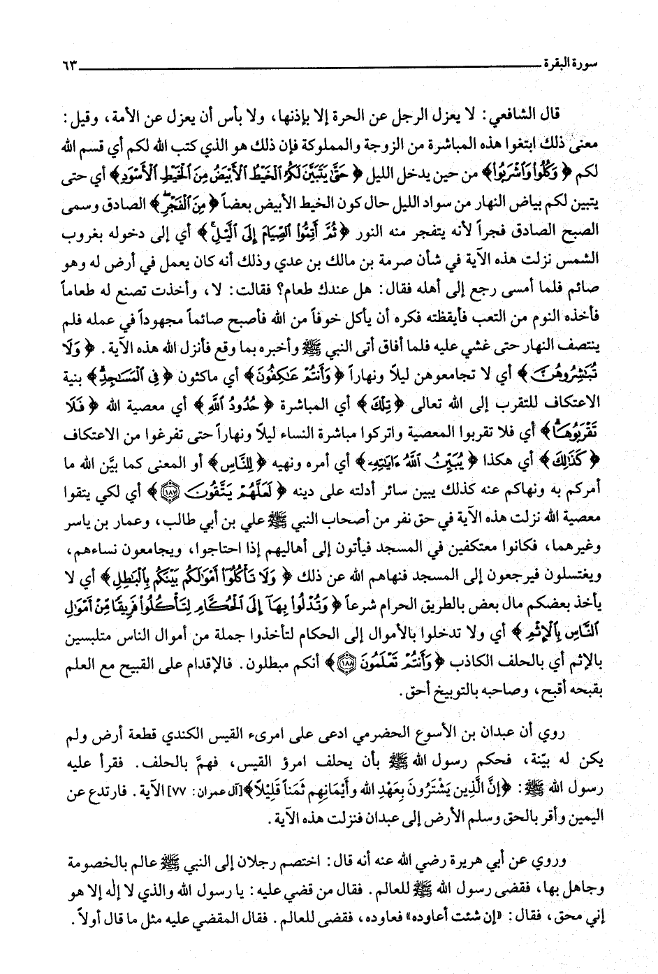 معنى ذلك ابتغوا هذه المباشرة من الزوجة والمملوكة فإن ذلك هو الذي كتب الله لكم أي قسم الله لكم وَكُلُوا وَاشْرَبُوا من حين يدخل الليل حَتَّى يَتَبَيَّنَ لَكُمُ الْخَيْطُ الْأَبْيَضُ مِنَ الْخَيْطِ الْأَسْوَدِ أي حتى يتبين لكم بياض النهار من سواد الليل حال كون الخيط الأبيض بعضا مِنَ الْفَجْرِ الصادق وسمى الصبح الصادق فجرا لأنه يتفجر منه النور ثُمَّ أَتِمُّوا الصِّيامَ إِلَى اللَّيْلِ أي إلى دخوله بغروب الشمس نزلت هذه الآية في شأن صرمة بن مالك بن عدي وذلك أنه كان يعمل في أرض له وهو صائم فلما أمسى رجع إلى أهله فقال: هل عندك طعام؟ فقالت: لا، وأخذت تصنع له طعاما فأخذه النوم من التعب فأيقظته فكره أن يأكل خوفا من الله فأصبح صائما مجهودا في عمله فلم ينتصف النهار حتى غشي عليه فلما أفاق أتى النبي صلّى الله عليه وسلّم وأخبره بما وقع فأنزل الله هذه الآية. وَلا تُبَاشِرُوهُنَّ أي لا تجامعوهن ليلا ونهارا وَأَنْتُمْ عاكِفُونَ أي ماكثون فِي الْمَساجِدِ بنية الاعتكاف للتقرب إلى الله تعالى تِلْكَ أي المباشرة حُدُودُ اللَّهِ أي معصية الله فَلا تَقْرَبُوها أي فلا تقربوا المعصية واتركوا مباشرة النساء ليلا ونهارا حتى تفرغوا من الاعتكاف كَذلِكَ أي هكذا يُبَيِّنُ اللَّهُ آياتِهِ أي أمره ونهيه لِلنَّاسِ أو المعنى كما بيّن الله ما أمركم به ونهاكم عنه كذلك يبين سائر أدلته على دينه لَعَلَّهُمْ يَتَّقُونَ (187) أي لكي يتقوا معصية الله نزلت هذه الآية في حق نفر من أصحاب النبي صلّى الله عليه وسلّم علي بن أبي طالب، وعمار بن ياسر وغيرهما، فكانوا معتكفين في المسجد فيأتون إلى أهاليهم إذا احتاجوا، ويجامعون نساءهم، ويغتسلون فيرجعون إلى المسجد فنهاهم الله عن ذلك وَلا تَأْكُلُوا أَمْوالَكُمْ بَيْنَكُمْ بِالْباطِلِ أي لا يأخذ بعضكم مال بعض بالطريق الحرام شرعا وَتُدْلُوا بِها إِلَى الْحُكَّامِ لِتَأْكُلُوا فَرِيقاً مِنْ أَمْوالِ النَّاسِ بِالْإِثْمِ أي ولا تدخلوا بالأموال إلى الحكام لتأخذوا جملة من أموال الناس متلبسين بالإثم أي بالحلف الكاذب وَأَنْتُمْ تَعْلَمُونَ (188) أنكم مبطلون. فالإقدام على القبيح مع العلم بقبحه أقبح، وصاحبه بالتوبيخ أحق.