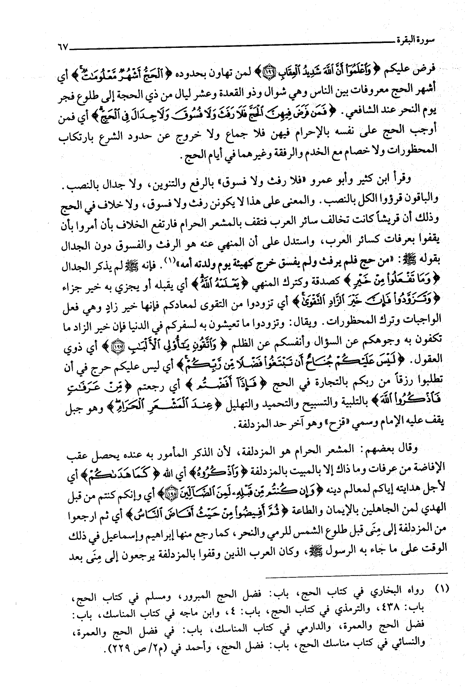 «1» . فإنه صلّى الله عليه وسلّم لم يذكر الجدال وَما تَفْعَلُوا مِنْ خَيْرٍ كصدقة وكترك المنهي يَعْلَمْهُ اللَّهُ أي يقبله أو يجزي به خير جزاء وَتَزَوَّدُوا فَإِنَّ خَيْرَ الزَّادِ التَّقْوى أي تزودوا من التقوى لمعادكم فإنها خير زاد وهي فعل الواجبات وترك المحظورات. ويقال: وتزودوا ما تعيشون به لسفركم في الدنيا فإن خير الزاد ما تكفون به وجوهكم عن السؤال وأنفسكم عن الظلم وَاتَّقُونِ يا أُولِي الْأَلْبابِ (197) أي ذوي العقول. لَيْسَ عَلَيْكُمْ جُناحٌ أَنْ تَبْتَغُوا فَضْلًا مِنْ رَبِّكُمْ أي ليس عليكم حرج في أن تطلبوا رزقا من ربكم بالتجارة في الحج فَإِذا أَفَضْتُمْ أي رجعتم مِنْ عَرَفاتٍ فَاذْكُرُوا اللَّهَ بالتلبية والتسبيح والتحميد والتهليل عِنْدَ الْمَشْعَرِ الْحَرامِ وهو جبل يقف عليه الإمام وسمي «قزح» وهو آخر حد المزدلفة.