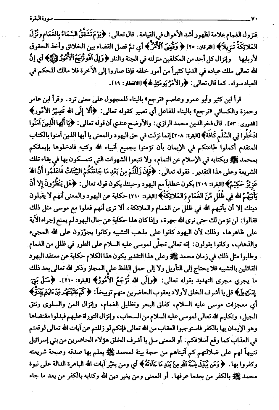 قرأ ابن كثير وأبو عمرو وعاصم «ترجع» بالبناء للمجهول على معنى ترد. وقرأ ابن عامر وحمزة والكسائي «ترجع» بالبناء للفاعل أي تصير كقوله تعالى: أَلا إِلَى اللَّهِ تَصِيرُ الْأُمُورُ [الشورى: 53] . قال فخر الدين محمد الرازي: والأوضح عندي أن قوله تعالى: يا أَيُّهَا الَّذِينَ آمَنُوا ادْخُلُوا فِي السِّلْمِ كَافَّةً [البقرة: 208] إنما نزلت في حق اليهود والمعنى يا أيّها الذين آمنوا بالكتاب المتقدم أكملوا طاعتكم في الإيمان بأن تؤمنوا بجميع أنبياء الله وكتبه فادخلوها بإيمانكم بمحمد صلّى الله عليه وسلّم وبكتابه في الإسلام عن التمام، ولا تتبعوا الشهوات التي تتمسكون بها في بقاء تلك الشريعة وعلى هذا التقدير. فقوله تعالى: فَإِنْ زَلَلْتُمْ مِنْ بَعْدِ ما جاءَتْكُمُ الْبَيِّناتُ فَاعْلَمُوا أَنَّ اللَّهَ عَزِيزٌ حَكِيمٌ [البقرة: 209] يكون خطابا مع اليهود وحينئذ يكون قوله تعالى: هَلْ يَنْظُرُونَ إِلَّا أَنْ يَأْتِيَهُمُ اللَّهُ فِي ظُلَلٍ مِنَ الْغَمامِ وَالْمَلائِكَةُ [البقرة: 210] حكاية عن اليهود والمعنى أنهم لا يقبلون دينك إلا أن يأتيهم الله في ظلل من الغمام والملائكة، ألا ترى أنهم فعلوا مع موسى مثل ذلك فقالوا: لن نؤمن لك حتى نرى الله جهرة، وإذا كان هذا حكاية عن حال اليهود لم يمنع إجراء الآية على ظاهرها، وذلك لأن اليهود كانوا على مذهب التشبيه وكانوا يجوّزون على الله المجيء والذهاب، وكانوا يقولون: إنه تعالى تجلّى لموسى عليه السلام على الطور في ظلل من الغمام وطلبوا مثل ذلك في زمان محمد صلّى الله عليه وسلّم وعلى هذا التقدير يكون هذا الكلام حكاية عن معتقد اليهود القائلين بالتشبيه فلا يحتاج إلى التأويل ولا إلى حمل اللفظ على المجاز وذكر الله تعالى بعد ذلك ما يجري مجرى التهديد بقوله تعالى: وَإِلَى اللَّهِ تُرْجَعُ الْأُمُورُ [البقرة: 210] .