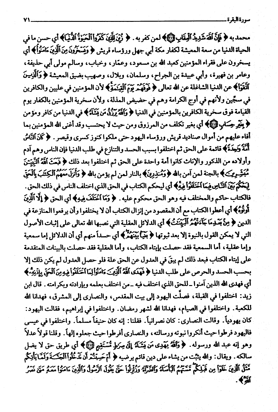 محمد به فَإِنَّ اللَّهَ شَدِيدُ الْعِقابِ (211) لمن كفر به. زُيِّنَ لِلَّذِينَ كَفَرُوا الْحَياةُ الدُّنْيا أي حسن ما في الحياة الدنيا من سعة المعيشة لكفار مكة أبي جهل ورؤساء قريش وَيَسْخَرُونَ مِنَ الَّذِينَ آمَنُوا أي يسخرون على فقراء المؤمنين كعبد الله بن مسعود، وعمّار، وخباب، وسالم مولى أبي حذيفة، وعامر بن فهيرة، وأبي عبيدة بن الجراح، وسلمان، وبلال، وصهيب بضيق المعيشة وَالَّذِينَ اتَّقَوْا عن الدنيا الشاغلة عن الله تعالى فَوْقَهُمْ يَوْمَ الْقِيامَةِ لأن المؤمنين في عليين والكافرين في سجّين ولأنهم في أوج الكرامة وهم في حضيض المذلة، ولأن سخرية المؤمنين بالكفار يوم القيامة فوق سخرية الكافرين بالمؤمنين في الدنيا وَاللَّهُ يَرْزُقُ مَنْ يَشاءُ في الدنيا من كافر ومؤمن بِغَيْرِ حِسابٍ (212) أي بغير تكلف من المرزوق ومن حيث لا يحتسب وقد أغنى الله المؤمنين بما أفاء عليهم من أموال صناديد قريش ورؤساء اليهود حتى ملكوا كنوز كسرى وقيصر. كانَ النَّاسُ أُمَّةً واحِدَةً قائمة على الحق ثم اختلفوا بسبب الحسد والتنازع في طلب الدنيا فإن الناس وهم آدم وأولاده من الذكور والإناث كانوا أمة واحدة على الحق ثم اختلفوا بعد ذلك فَبَعَثَ اللَّهُ النَّبِيِّينَ مُبَشِّرِينَ بالجنة لمن آمن بالله وَمُنْذِرِينَ بالنار لمن لم يؤمن بالله وَأَنْزَلَ مَعَهُمُ الْكِتابَ بِالْحَقِّ لِيَحْكُمَ بَيْنَ النَّاسِ فِيمَا اخْتَلَفُوا فِيهِ أي ليحكم الكتاب في الحق الذي اختلف الناس في ذلك الحق.