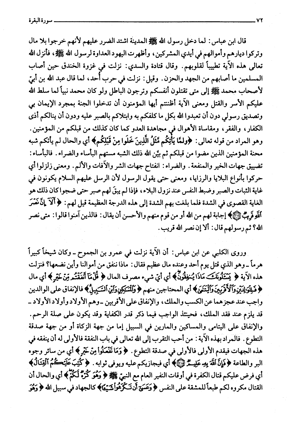 تضييق جهات الخير والمنفعة. والضراء: انفتاح جهات الشر والآفات والألم. ومعنى زلزلوا أي حركوا بأنواع البلايا والرزايا، ومعنى حتى يقول الرسول لأن الرسل عليهم السلام يكونون في غاية الثبات والصبر وضبط النفس عند نزول البلاء، فإذا لم يبق لهم صبر حتى ضجوا كان ذلك هو الغاية القصوى في الشدة فلما بلغت بهم الشدة إلى هذه الدرجة العظيمة قيل لهم: أَلا إِنَّ نَصْرَ اللَّهِ قَرِيبٌ (214) إجابة لهم من الله أو من قوم منهم والأحسن أن يقال: فالذين آمنوا قالوا: متى نصر الله؟ ثم رسولهم قال: ألا إن نصر الله قريب.