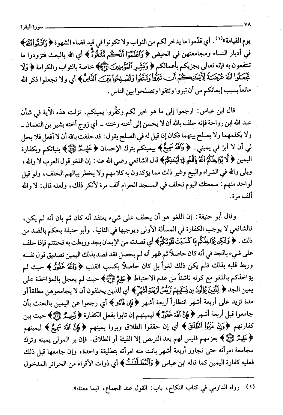 قال ابن عباس: ارجعوا إلى ما هو خير لكم وكفّروا يمينكم. نزلت هذه الآية في شأن عبد الله ابن رواحة فإنه حلف بالله أن لا يحسن إلى أخته وختنه- أي زوج أخته بشير بن النعمان- ولا يكلمهما ولا يصلح بينهما فكان إذا قيل له في الصلح يقول: قد حلفت بالله أن لا أفعل فلا يحل لي أن لا أبرّ في يميني. وَاللَّهُ سَمِيعٌ بيمينكم بترك الإحسان عَلِيمٌ (224) بنياتكم وبكفارة اليمين لا يُؤاخِذُكُمُ اللَّهُ بِاللَّغْوِ فِي أَيْمانِكُمْ قال الشافعي رضي الله عنه: إن اللغو قول العرب لا والله، وبلى والله في الشراء والبيع وغير ذلك مما يؤكدون به كلامهم ولا يخطر ببالهم الحلف، ولو قيل لواحد منهم: سمعتك اليوم تحلف في المسجد الحرام ألف مرة لأنكر ذلك، ولعله قال: لا والله ألف مرة.