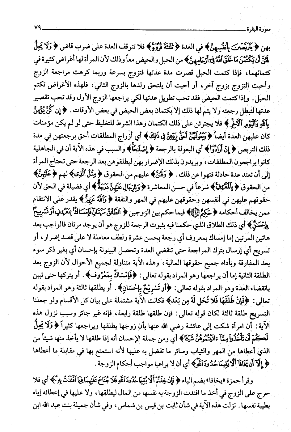 بهن يَتَرَبَّصْنَ بِأَنْفُسِهِنَّ في العدة ثَلاثَةَ قُرُوءٍ فلا تتوقف العدة على ضرب قاض وَلا يَحِلُّ لَهُنَّ أَنْ يَكْتُمْنَ ما خَلَقَ اللَّهُ فِي أَرْحامِهِنَّ من الحبل والحيض معا وذلك لأن المرأة لها أغراض كثيرة في كتمانهما، فإذا كتمت الحبل قصرت مدة عدتها فتزوج بسرعة وربما كرهت مراجعة الزوج وأحبت التزوج بزوج آخر، أو أحبت أن يلتحق ولدها بالزوج الثاني، فلهذه الأغراض تكتم الحبل. وإذا كتمت الحيض فقد تحب تطويل عدتها لكي يراجعها الزوج الأول وقد تحب تقصير عدتها لتبطل رجعته ولا يتم لها ذلك إلا بكتمان بعض الحيض في بعض الأوقات. إِنْ كُنَّ يُؤْمِنَّ بِاللَّهِ وَالْيَوْمِ الْآخِرِ فلا يجترئن على ذلك الكتمان وهذا الشرط للتغليظ حتى لو لم يكن مؤمنات كان عليهن العدة أيضا وَبُعُولَتُهُنَّ أَحَقُّ بِرَدِّهِنَّ فِي ذلِكَ أي أزواج المطلقات أحق برجعتهن في مدة ذلك التربص إِنْ أَرادُوا أي البعولة بالرجعة أَصْلَحا والسبب في هذه الآية أن في الجاهلية كانوا يراجعون المطلقات، ويريدون بذلك الإضرار بهن ليطلقوهن بعد الرجعة حتى تحتاج المرأة إلى أن تعتد عدة حادثة فنهوا عن ذلك. وَلَهُنَّ عليهم من الحقوق مِثْلُ الَّذِي لهم عَلَيْهِنَّ من الحقوق بِالْمَعْرُوفِ شرعا في حسن المعاشرة وَلِلرِّجالِ عَلَيْهِنَّ دَرَجَةٌ أي فضيلة في الحق لأن حقوقهم عليهن في أنفسهن وحقوقهن عليهم في المهر والنفقة وَاللَّهُ عَزِيزٌ يقدر على الانتقام ممن يخالف أحكامه حَكِيمٌ (228) فيما حكم بين الزوجين الطَّلاقُ مَرَّتانِ فَإِمْساكٌ بِمَعْرُوفٍ أَوْ تَسْرِيحٌ بِإِحْسانٍ أي ذلك الطلاق الذي حكمنا فيه بثبوت الرجعة للزوج هو أن يوجد مرتان فالواجب بعد هاتين المرتين إما إمساك بمعروف أي رجعة بحسن عشرة ولطف معاملة لا على قصد إضرار، أو تسريح أي إرسال بترك المراجعة حتى تنقضي العدة وتحصل البينونة بإحسان أي بغير ذكر سوء بعد المفارقة وبأداء جميع حقوقها المالية، وهذه الآية متناولة لجميع الأحوال لأن الزوج بعد الطلقة الثانية إما أن يراجعها وهو المراد بقوله تعالى: فَإِمْساكٌ بِمَعْرُوفٍ. أو يتركها حتى تبين بانقضاء العدة وهو المراد بقوله تعالى: أَوْ تَسْرِيحٌ بِإِحْسانٍ. أو يطلقها ثالثة وهو المراد بقوله تعالى: فَإِنْ طَلَّقَها فَلا تَحِلُّ لَهُ مِنْ بَعْدُ فكانت الآية مشتملة على بيان كل الأقسام ولو جعلنا التسريح طلقة ثالثة لكان قوله تعالى: فإن طلقها طلقة رابعة، فإنه غير جائز وسبب نزول هذه الآية: أن امرأة شكت إلى عائشة رضي الله عنها بأن زوجها يطلقها ويراجعها كثيرا وَلا يَحِلُّ لَكُمْ أَنْ تَأْخُذُوا مِمَّا آتَيْتُمُوهُنَّ شَيْئاً أي ومن جملة الإحسان أنه إذا طلقها لا يأخذ منها شيئا من الذي أعطاها من المهر والثياب وسائر ما تفضل به عليها لأنه استمتع بها في مقابلة ما أعطاها إِلَّا أَنْ يَخافا أَلَّا يُقِيما حُدُودَ اللَّهِ أي أن لا يراعيا مواجب أحكام الزوجة.