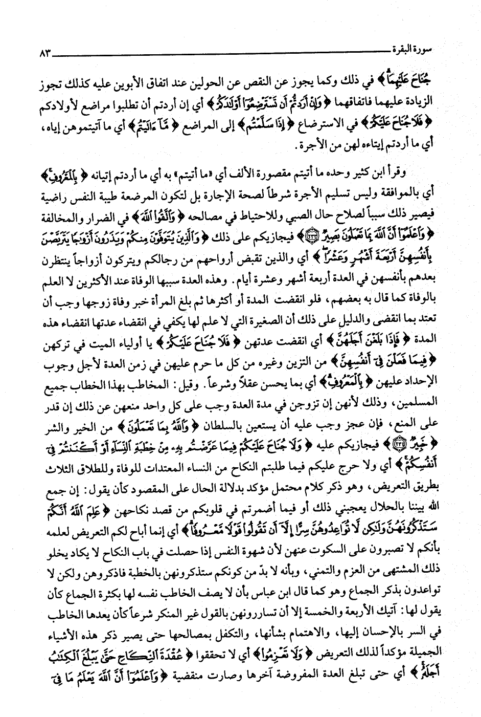 وجب عليه أن يستعين بالسلطان وَاللَّهُ بِما تَعْمَلُونَ من الخير والشر خَبِيرٌ (234) فيجازيكم عليه وَلا جُناحَ عَلَيْكُمْ فِيما عَرَّضْتُمْ بِهِ مِنْ خِطْبَةِ النِّساءِ أَوْ أَكْنَنْتُمْ فِي أَنْفُسِكُمْ أي ولا حرج عليكم فيما طلبتم النكاح من النساء المعتدات للوفاة وللطلاق الثلاث بطريق التعريض، وهو ذكر كلام محتمل مؤكد بدلالة الحال على المقصود كأن يقول: إن جمع الله بيننا بالحلال يعجبني ذلك أو فيما أضمرتم في قلوبكم من قصد نكاحهن عَلِمَ اللَّهُ أَنَّكُمْ سَتَذْكُرُونَهُنَّ وَلكِنْ لا تُواعِدُوهُنَّ سِرًّا إِلَّا أَنْ تَقُولُوا قَوْلًا مَعْرُوفاً أي إنما أباح لكم التعريض لعلمه بأنكم لا تصبرون على السكوت عنهن لأن شهوة النفس إذا حصلت في باب النكاح لا يكاد يخلو ذلك المشتهى من العزم والتمني، وبأنه لا بدّ من كونكم ستذكرونهن بالخطبة فاذكروهن ولكن لا تواعدون بذكر الجماع وهو كما قال ابن عباس بأن لا يصف الخاطب نفسه لها بكثرة الجماع كأن يقول لها: آتيك الأربعة والخمسة إلا أن تساررونهن بالقول غير المنكر شرعا كأن يعدها الخاطب في السر بالإحسان إليها، والاهتمام بشأنها، والتكفل بمصالحها حتى يصير ذكر هذه الأشياء الجميلة مؤكدا لذلك التعريض وَلا تَعْزِمُوا أي لا تحققوا عُقْدَةَ النِّكاحِ حَتَّى يَبْلُغَ الْكِتابُ أَجَلَهُ أي حتى تبلغ العدة المفروضة آخرها وصارت منقضية وَاعْلَمُوا أَنَّ اللَّهَ يَعْلَمُ ما فِي