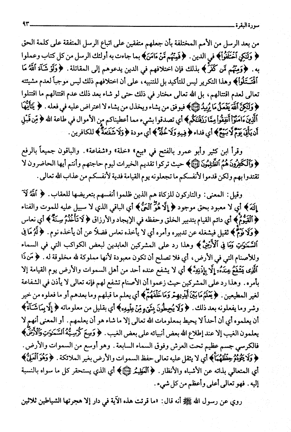 وقيل: المعنى: والتاركون للزكاة هم الذين ظلموا أنفسهم بتعريضها للعقاب. اللَّهُ لا إِلهَ أي لا معبود بحق موجود إِلَّا هُوَ الْحَيُّ أي الباقي الذي لا سبيل عليه للموت والفناء الْقَيُّومُ أي دائم القيام بتدبير الخلق وحفظه في الإيجاد والأرزاق لا تَأْخُذُهُ سِنَةٌ أي نعاس وَلا نَوْمٌ ثقيل فيشغله عن تدبيره وأمره أي لا يأخذه نعاس فضلا عن أن يأخذه نوم. لَهُ ما فِي السَّماواتِ وَما فِي الْأَرْضِ وهذا رد على المشركين العابدين لبعض الكواكب التي في السماء وللأصنام التي في الأرض، أي فلا تصلح أن تكون معبودة لأنها مملوكة لله مخلوقة له. مَنْ ذَا الَّذِي يَشْفَعُ عِنْدَهُ إِلَّا بِإِذْنِهِ أي لا يشفع عنده أحد من أهل السموات والأرض يوم القيامة إلا بأمره. وهذا رد على المشركين حيث زعموا أن الأصنام تشفع لهم فإنه تعالى لا يأذن في الشفاعة لغير المطيعين. يَعْلَمُ ما بَيْنَ أَيْدِيهِمْ وَما خَلْفَهُمْ أي يعلم ما قبلهم وما بعدهم أو ما فعلوه من خير وشر وما يفعلونه بعد ذلك. وَلا يُحِيطُونَ بِشَيْءٍ مِنْ عِلْمِهِ أي بقليل من معلوماته إِلَّا بِما شاءَ أن يعلموه أي أن أحدا لا يحيط بمعلومات الله تعالى إلا ما شاء هو أن يعلمهم. أو المعنى أنهم لا يعلمون الغيب إلا عند إطلاع الله بعض أنبيائه على بعض الغيب. وَسِعَ كُرْسِيُّهُ السَّماواتِ وَالْأَرْضَ فالكرسي جسم عظيم تحت العرش وفوق السماء السابعة. وهو أوسع من السموات والأرض.
