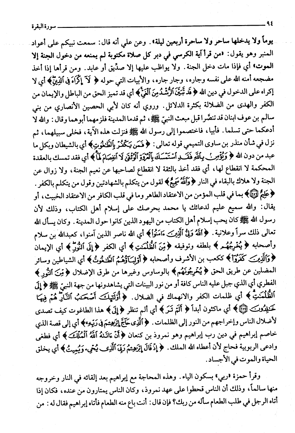 أي فإذا مات دخل الجنة. ولا يواظب عليها إلا صدّيق أو عابد. ومن قرأها إذا أخذ مضجعه أمنه الله على نفسه وجاره، وجار جاره، والأبيات التي حوله لا إِكْراهَ فِي الدِّينِ أي لا إكراه على الدخول في دين الله قَدْ تَبَيَّنَ الرُّشْدُ مِنَ الْغَيِّ أي قد تميز الحق من الباطل والإيمان من الكفر والهدى من الضلالة بكثرة الدلائل. وروي أنه كان لأبي الحصين الأنصاري من بني سالم بن عوف ابنان قد تنصّرا قبل مبعث النبيّ صلّى الله عليه وسلّم، ثم قدما المدينة فلزمهما أبوهما وقال: والله لا أدعكما حتى تسلما. فأبيا، فاختصموا إلى رسول الله صلّى الله عليه وسلّم فنزلت هذه الآية، فخلى سبيلهما، ثم نزل في شأن منذر بن ساوى التميمي قوله تعالى: فَمَنْ يَكْفُرْ بِالطَّاغُوتِ أي بالشيطان وبكل ما عبد من دون الله وَيُؤْمِنْ بِاللَّهِ فَقَدِ اسْتَمْسَكَ بِالْعُرْوَةِ الْوُثْقى لَا انْفِصامَ لَها أي فقد تمسك بالعقدة المحكمة لا انقطاع لها، أي فقد أخذ بالثقة لا انقطاع لصاحبها عن نعيم الجنة، ولا زوال عن الجنة ولا هلاك بالبقاء في النار وَاللَّهُ سَمِيعٌ لقول من يتكلم بالشهادتين وقول من يتكلم بالكفر.