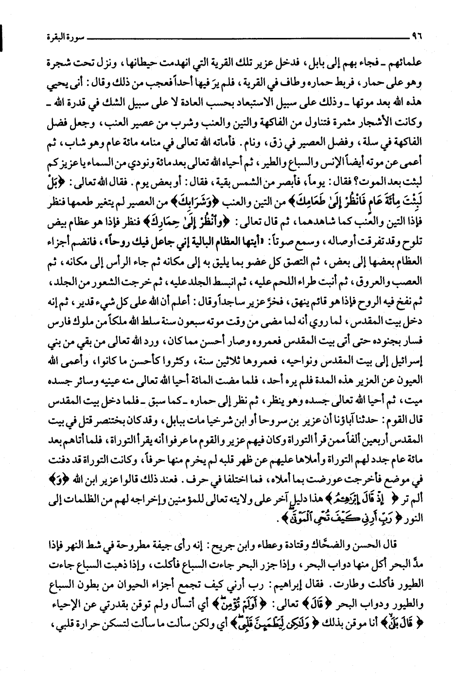 علمائهم- فجاء بهم إلى بابل، فدخل عزير تلك القرية التي انهدمت حيطانها، ونزل تحت شجرة وهو على حمار، فربط حماره وطاف في القرية، فلم ير فيها أحدا فعجب من ذلك وقال: أنى يحيي هذه الله بعد موتها- وذلك على سبيل الاستبعاد بحسب العادة لا على سبيل الشك في قدرة الله- وكانت الأشجار مثمرة فتناول من الفاكهة والتين والعنب وشرب من عصير العنب، وجعل فضل الفاكهة في سلة، وفضل العصير في زق، ونام. فأماته الله تعالى في منامه مائة عام وهو شاب، ثم أعمى عن موته أيضا الإنس والسباع والطير، ثم أحياه الله تعالى بعد مائة ونودي من السماء يا عزير كم لبثت بعد الموت؟ فقال: يوما، فأبصر من الشمس بقية، فقال: أو بعض يوم. فقال الله تعالى: بَلْ لَبِثْتَ مِائَةَ عامٍ فَانْظُرْ إِلى طَعامِكَ من التين والعنب وَشَرابِكَ من العصير لم يتغير طعمها فنظر فإذا التين والعنب كما شاهدهما، ثم قال تعالى: وَانْظُرْ إِلى حِمارِكَ فنظر فإذا هو عظام بيض تلوح وقد تفرقت أوصاله، وسمع صوتا: «أيتها العظام البالية إني جاعل فيك روحا» ، فانضم أجزاء العظام بعضها إلى بعض، ثم التصق كل عضو بما يليق به إلى مكانه ثم جاء الرأس إلى مكانه، ثم العصب والعروق، ثم أنبت طراء اللحم عليه، ثم انبسط الجلد عليه، ثم خرجت الشعور من الجلد، ثم نفخ فيه الروح فإذا هو قائم ينهق، فخرّ عزير ساجدا وقال: أعلم أن الله على كل شيء قدير، ثم إنه دخل بيت المقدس، لما روي أنه لما مضى من وقت موته سبعون سنة سلط الله ملكا من ملوك فارس فسار بجنوده حتى أتى بيت المقدس فعمروه وصار أحسن مما كان، ورد الله تعالى من بقي من بني إسرائيل إلى بيت المقدس ونواحيه، فعمروها ثلاثين سنة، وكثروا كأحسن ما كانوا، وأعمى الله العيون عن العزير هذه المدة فلم يره أحد، فلما مضت المائة أحيا الله تعالى منه عينيه وسائر جسده ميت، ثم أحيا الله تعالى جسده وهو ينظر، ثم نظر إلى حماره- كما سبق- فلما دخل بيت المقدس قال القوم: حدثنا آباؤنا أن عزير بن سروحا أو ابن شرخيا مات ببابل، وقد كان بختنصر قتل في بيت المقدس أربعين ألفا ممن قرأ التوراة وكان فيهم عزير والقوم ما عرفوا أنه يقرأ التوراة، فلما أتاهم بعد مائة عام جدد لهم التوراة وأملاها عليهم عن ظهر قلبه لم يخرم منها حرفا، وكانت التوراة قد دفنت في موضع فأخرجت عورضت بما أملاه، فما اختلفا في حرف. فعند ذلك قالوا عزير ابن الله وَأ لم تر إِذْ قالَ إِبْراهِيمُ هذا دليل آخر على ولايته تعالى للمؤمنين وإخراجه لهم من الظلمات إلى النور رَبِّ أَرِنِي كَيْفَ تُحْيِ الْمَوْتى.