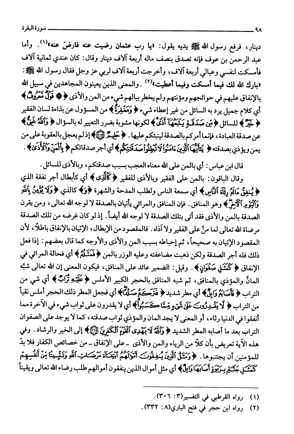 «2» . والمعنى الذين يعينون المجاهدين في سبيل الله بالإنفاق عليهم في حوائجهم ومؤنتهم ولم يخطر ببالهم شيء من المن والأذى قَوْلٌ مَعْرُوفٌ أي كلام جميل يرد به السائل من غير إعطاء شيء وَمَغْفِرَةٌ من المسؤول عن بذاءة لسان الفقير خَيْرٌ للسائل مِنْ صَدَقَةٍ يَتْبَعُها أَذىً لكونها مشوبة بضرر التعيير له بالسؤال وَاللَّهُ غَنِيٌّ عن صدقة العبادة، فإنما أمركم بالصدقة لينبئكم عليها. حَلِيمٌ (263) إذ لم يعجل بالعقوبة على من يمن ويؤذي بصدقته يا أَيُّهَا الَّذِينَ آمَنُوا لا تُبْطِلُوا صَدَقاتِكُمْ أي أجر صدقاتكم بِالْمَنِّ وَالْأَذى.