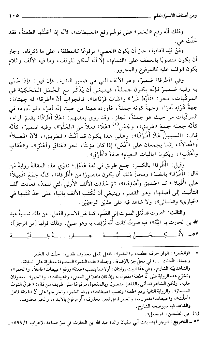 وفي "أطرقا" ضميرٌ، وهو الألف التي هي ضمير التثنية. فإن قيل: فإذا سُمّي به وفيه ضميرٌ فإنّه يكون جملةً، فينبغي أن يُذْكَر مع الجُمَل المَحْكِيّة في المركَّبات، نحو: "تَأَبَّطَ شَرَّا" و"شَابَ قَرْنَاهَا"، فالجواب أنّ "أطرقا" له جِهتان: جهةُ كَوْنِه أمرًا، وجهةُ كونه جملةً، فأورده ههنا من حيث إنّه أمرٌ، ولو أورده في المركَّبات من حيث هو جملةٌ، لجاز. وقد روى بعضهم: "عَلَا أَطْرُقًا" بضمّ الراء، كأنّه جعله جمعَ "طرِيقٍ"، وجَعَل (¬1) "عَلَا" فعلاً من "العُلُوّ"، وفيه ضميرٌ، كأنّه قال: "السبيلُ عَلَا أطْرُقًا"، وعلى هذا يكون قد أنَّثَ "الطريق", لأنّ "فَعِيلاً" و"فُعالاً"، إنّما يجمعان على "أفعُل" إذا كان مؤنثًا، نحو"عَناقٍ وأعنُقٍ"، و"عُقابٍ وأعْقُبٍ"، ويكون "باليات الخيام" صفةَ "أطرُقٍ".