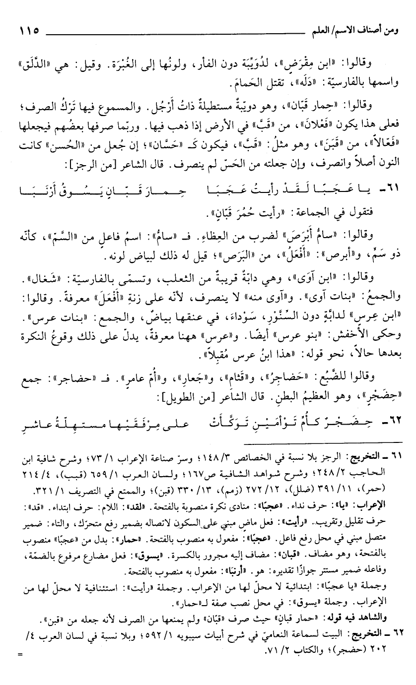 61 - التخريج: الرجز بلا نسبة في الخصائص 3/ 148؛ وسرّ صناعة الإعراب 1/ 73؛ وشرح شافية ابن الحاجب 2/ 248؛ وشرح شواهد الشافية ص 167؛ ولسان العرب 1/ 659 (قبب)، 4/ 214 (حمر)، 11/ 391 (ضلل)، 12/ 272 (زمم)، 13/ 330 (قبن)؛ والممتع في التصريف 1/ 321.