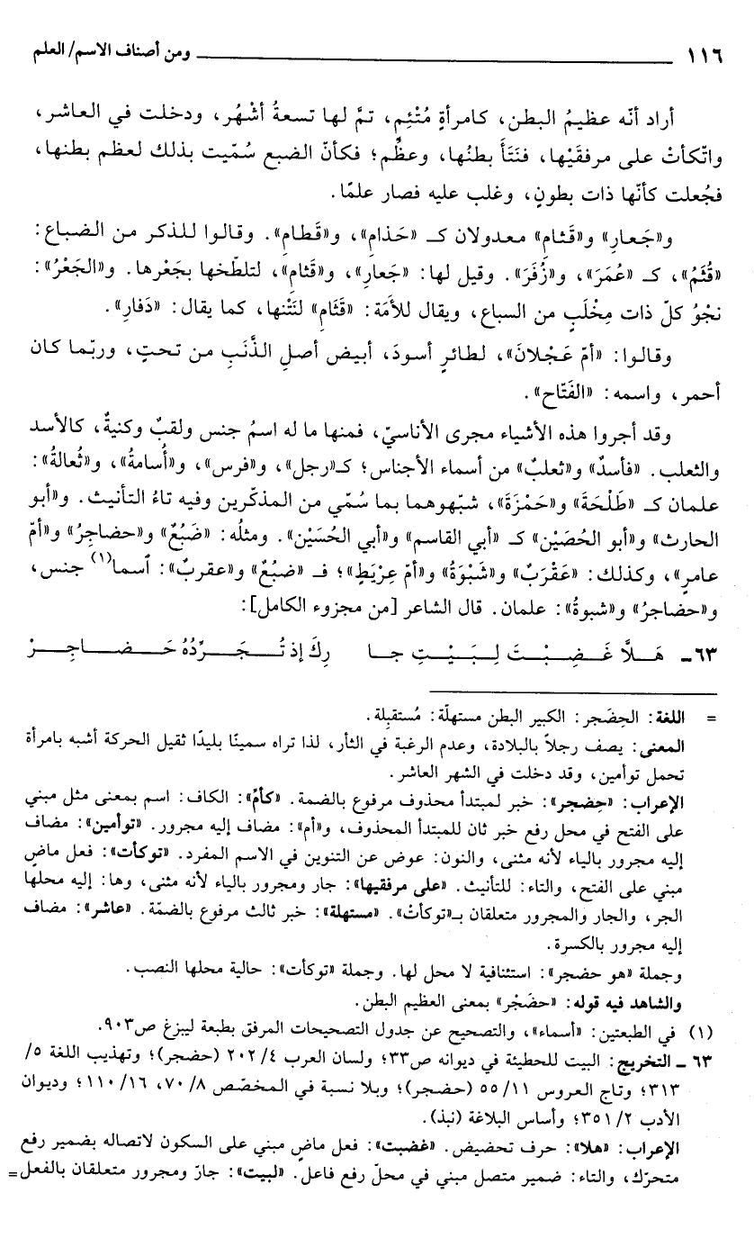 وقد أجروا هذه الأشياء مجرى الأناسيّ، فمنها ما له اسمُ جنس ولقبٌ وكنيةٌ، كالأسد والثعلب. "فأسدٌ" و"ثعلبٌ" من أسماء الأجناس؛ كـ"رجل"، و"فرس"، و"أُسامةُ"، و"ثُعالةُ": علمان كـ"طَلْحَةَ" و"حَمْزَةَ"، شبّهوهما بما سُمّي من المذكّرين وفيه تاءُ التأنيث. و"أبو الحارث" و"أبو الحُصَيْن" كـ "أبي القاسم" و"أبي الحُسَيْن". ومثلُه: "ضَبُعٌ" و"حضاجرُ" و"أمّ عامرٍ"، وكذلك: "عَقْرَبٌ" و"شَبْوَةُ" و"أمّ عِرْيَطِ"؛ ف "ضبُعٌ" و"عقربٌ": اسما (¬1) جنس، و"حضاجرُ" و"شبوةُ": علمان. قال الشاعر [من مجزوء الكامل]: