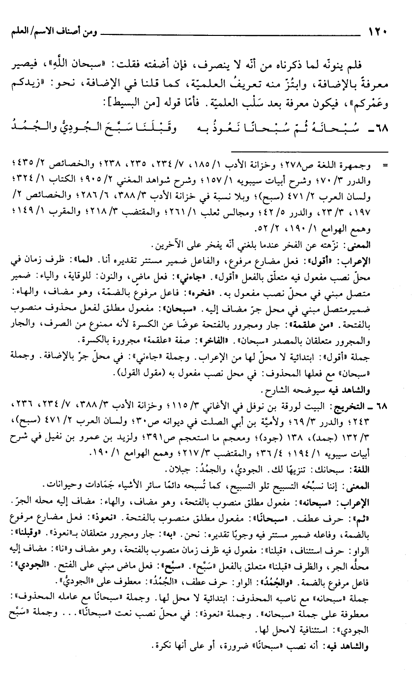 فلم ينونّه لما ذكرناه من أنّه لا ينصرف، فإن أضفته فقلت: "سبحان اللَّهِ"، فيصير معرفةً بالإضافة، وابتُزّ منه تعريفُ العلميّة، كما قلنا في الإضافة، نحو: "زيدكم وعَمْركم"، فيكون معرفة بعد سَلْب العلميّة. فأمّا قوله [من البسيط]: