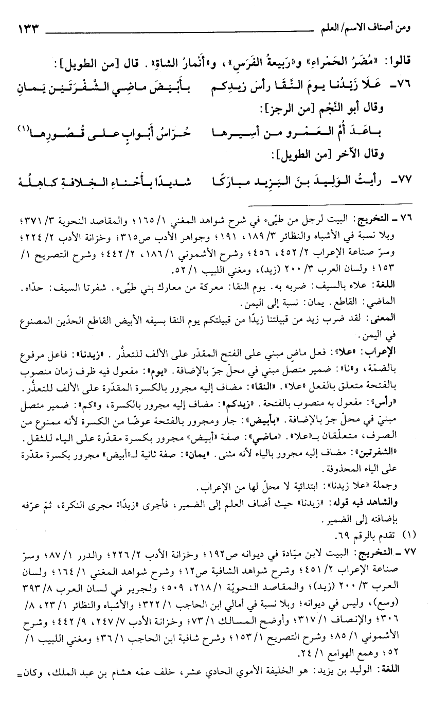 76 - التخريج: البيت لرجل من طيِّىء في شرح شواهد المغني 1/ 165؛ والمقاصد النحوية 3/ 371؛ وبلا نسبة في الأشباه والنظائر 3/ 189، 191؛ وجواهر الأدب ص 315؛ وخزانة الأدب 2/ 224؛ وسرّ صناعة الإعراب 2/ 452، 456؛ وشرح الأشموني 1/ 186، 2/ 442؛ وشرح التصريح 1/ 153؛ ولسان العرب 3/ 200 (زيد)، ومغني اللبيب 1/ 52.
