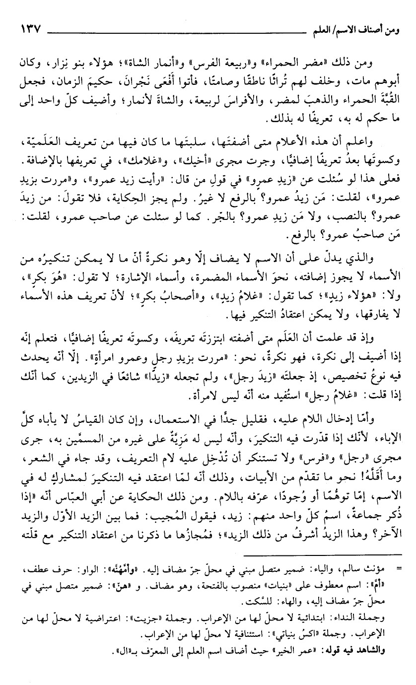 واعلم أن هذه الأعلام متى أضفتَها، سلبتَها ما كان فيها من تعريف العَلَميّة، وكسوتَها بعدُ تعريفًا إضافيًّا، وجرت مجرى "أخيك"، و"غلامك"، في تعريفها بالإضافة. فعلى هذا لو سُئلت عن "زيدِ عمرٍو" في قولِ من قال: "رأيت زيد عمرو"، و"مررت بزيدِ عمرو"، لقلت: مَن زيدُ عمرو؟ بالرفع لا غيرُ. ولم يجز الحِكاية، فلا تقولَ: من زيدَ عمرو؟ بالنصب، ولا مَن زيدِ عمرو؟ بالجّر. كما لو سئلت عن صاحب عمرو، لقلت: مَن صاحبُ عمرو؟ بالرفع.