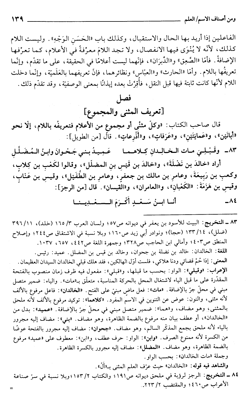 والشاهد فيه قوله: "الخالدان" حيث عرّف العلم المثنى بـ "أَل".