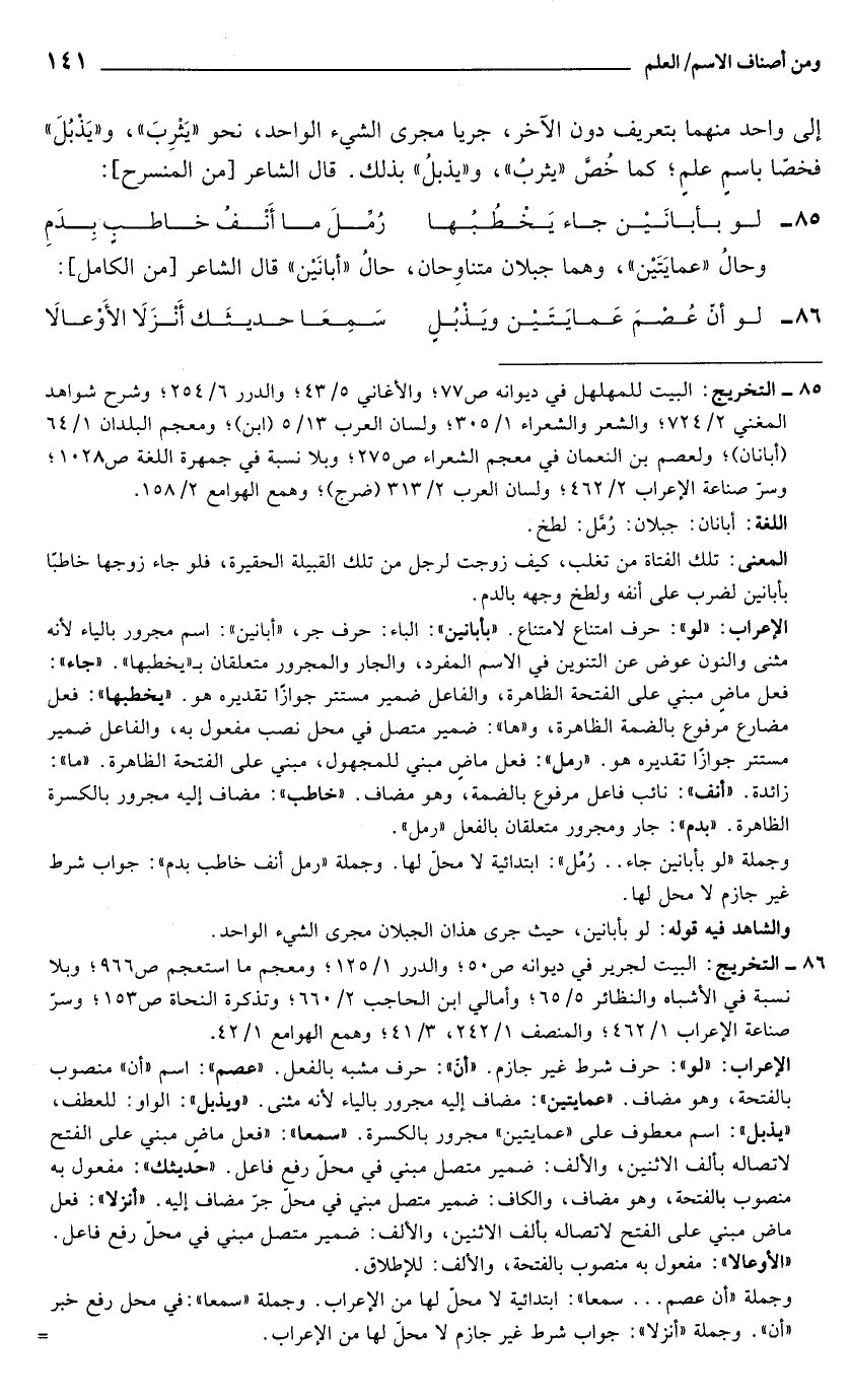 الإعراب: "لو": حرف شرط غير جازم. "أنّ": حرف مشبه بالفعل. "عصم": اسم "أن" منصوب بالفتحة، وهو مضاف. "عمايتين": مضاف إليه مجرور بالياء لأنه مثنى. "ويذبل": الواو: للعطف، "يذبل": اسم معطوف على "عمايتين" مجرور بالكسرة. "سمعا": "فعل ماضٍ مبني على الفتح لاتصاله بألف الاثنين، والألف: ضمير متصل مبني في محل رفع فاعل."حديثك": مفعول به منصوب بالفتحة، وهو مضاف، والكاف: ضمير متصل مبني في محل جرّ مضاف إليه. "أنزلا": فعل ماض مبني على الفتح لاتصاله بألف الاثنين، والألف: ضمير متصل مبني في محلّ رفع فاعل. "الأوعالا": مفعول به منصوب بالفتحة، والألف: للإطلاق.