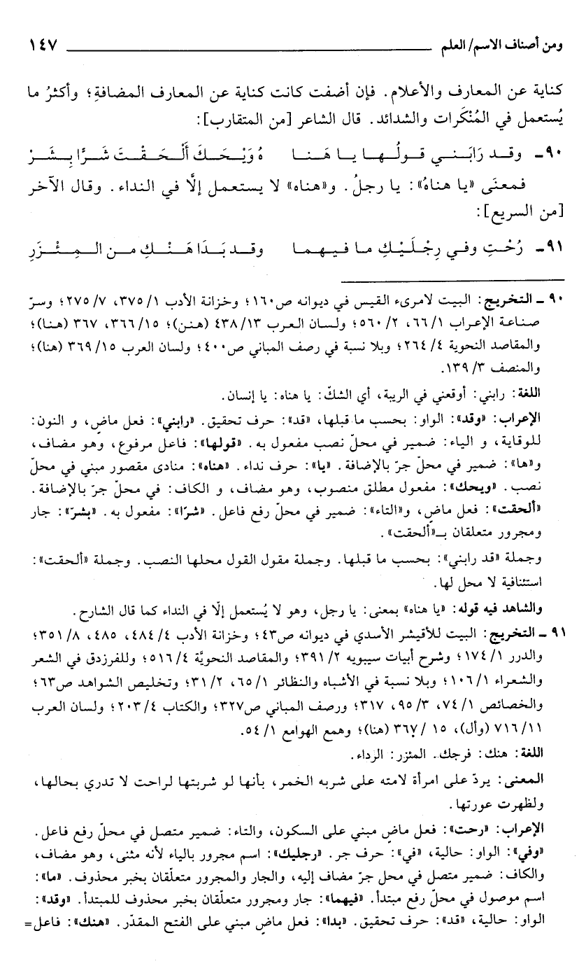 90 - التخريج: البيت لامرىء القيس في ديوانه ص 160؛ وخزانة الأدب 1/ 375، 7/ 275؛ وسرّ صناعة الإعراب 1/ 66، 2/ 560؛ ولسان العرب 13/ 438 (هنن)؛ 15/ 366، 367 (هنا)؛ والمقاصد النحوية 4/ 264؛ وبلا نسبة في رصف المباني ص400؛ ولسان العرب 15/ 369 (هنا)؛ والمنصف 3/ 139.