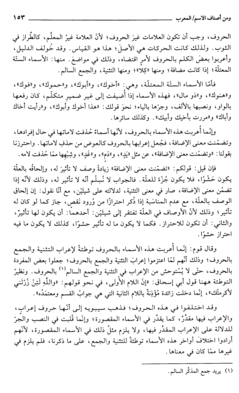 وإنما أُعربت هذه الأسماء بالحروف, لأنها أسماءٌ حُذفت لاماتها في حال إفرادها، وتضمّنت معنى الإضافة، فجُعل إعرابها بالحروف كالعوض من حذفِ لاماتها. واحترزنا بقولنا: "وتضمّنت معنى الإضافة"، عن مثل "يَدٍ"، و"دَم"، و"غَدٍ"، وشِبْهِها ممّا حُذفت لامه.