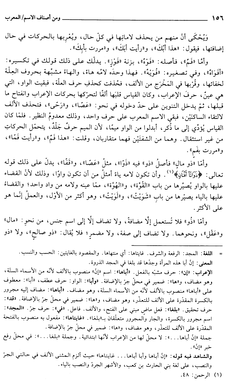 وأمّا "ذو مالٍ" فأصلُ "ذو" فيه "ذَوًا"، مثلُ "عَصًا"، و"قَفًا"، يدلّ على ذلك قوله تعالى: {ذَوَاتَا أَفْنَانٍ} (¬1). وأن تكون لامه ياءً أمثلُ من أن تكون واوًا، وذلك لأنّ القضاء عليها بالواو يُصيِّرها من باب "القُوَّة"، و"الهُوَّة"، ممّا عينه ولامه من واد واحد؛ والقضاءُ عليها بالياء يصيّرها من بابِ "شَوَيْتُ"، و"لَوَيْتُ"، وهو أكثر من الأوّل، والعملُ إنّما هو على الأكثر.