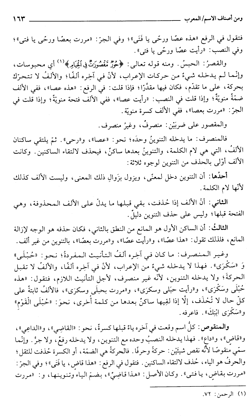فالمنصرف: ما يدخله التنوينُ وحدَه؛ نحو: "عصا"، و"رحى". ثمّ يلتقي ساكنان الألفُ، التي هي لام الكلمة، والتنوينُ بعدها ساكنٌ، فيحذف لالتقاء الساكنين. وكانت الألف أوْلى بالحذف من التنوين لوجوه ثلاثة: