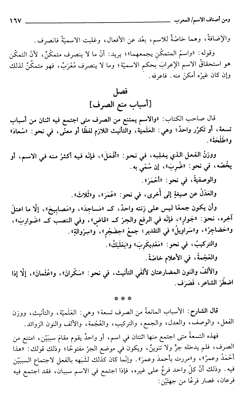 قال الشارح: الأسباب المانعةُ من الصرف تسعة؛ وهي: العَلَميّة، والتأنيث، ووزن الفعل، والوصف، والعدل، والجمع، والتركيب، والعُجْمة، والألف والنون الزوائد.