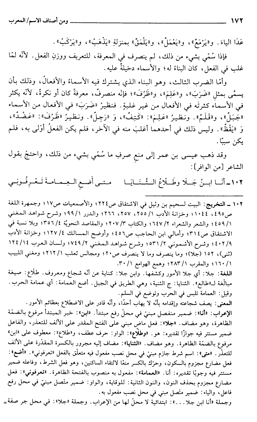 الإعراب: "أنا": ضمير منفصل مبني في محلّ رفع مبتدأ. "ابن": خبر المبتدأ مرفوع بالضمّة الظاهرة، وهو مضاف. "جلا": فعل ماض مبني على الفتح المقدر على الألف للتعذر، والفاعل ضمير مستتر فيه جوازًا تقديره: هو. "وطلّاع": الواو: حرف عطف، و"طلاع": معطوف على "ابن" مرفوع بالضمّة الظاهرة. وهو مضاف. "الثنايا": مضاف إليه مجرور بالكسرة المقدّرة على الألف للتعذر. "متى": اسم شرط جازم مبني في محل نصب مفعول فيه متعلّق بالفعل "تعرفوني". "أضع": فعل مضارع مجزوم بالسكون، وحرّك بالكسر منعًا لالتقاء الساكنين، وهو فعل الشرط، وفاعله ضمير مستتر فيه وجوبًا تقديره: أنا. "العمامة": مفعول به منصوب بالفتحة الظاهرة. "تعرفوني": فعل مضارع مجزوم بحذف النون، والنون الثانية: للوقاية، والواو: ضمير متّصل مبني في محل رفع فاعل، والياء: ضمير متصل مبني في محل نصب مفعول به.