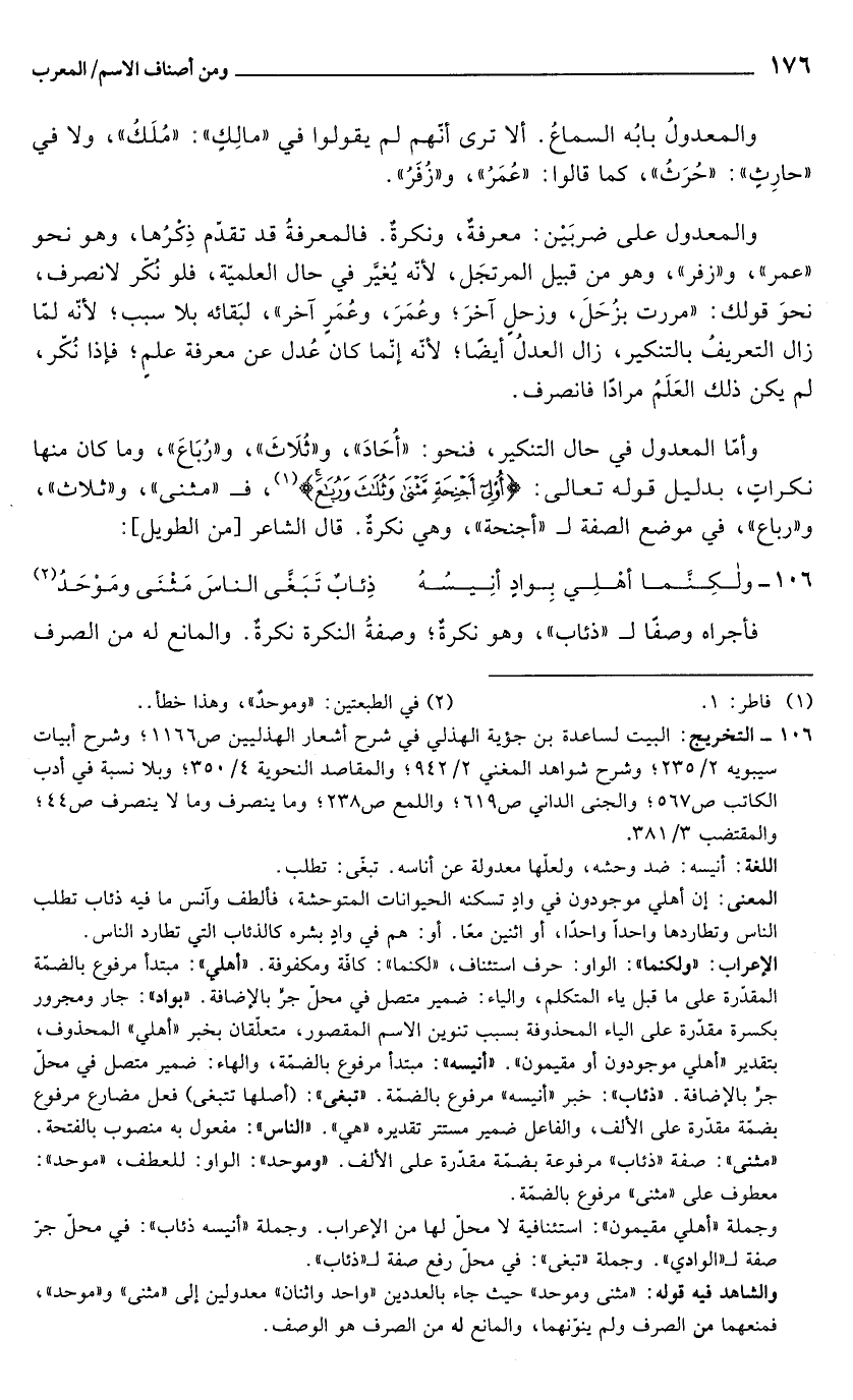 106 - التخريج: البيت لساعدة بن جؤية الهذلي في شرح أشعار الهذليين ص 1166؛ وشرح أبيات سيبويه 2/ 235؛ وشرح شواهد المغني 2/ 942؛ والمقاصد النحوية 4/ 350؛ وبلا نسبة في أدب الكاتب ص 567؛ والجنى الداني ص 619؛ واللمع ص 238؛ وما ينصرف وما لا ينصرف ص 44؛ والمقتضب 3/ 381.