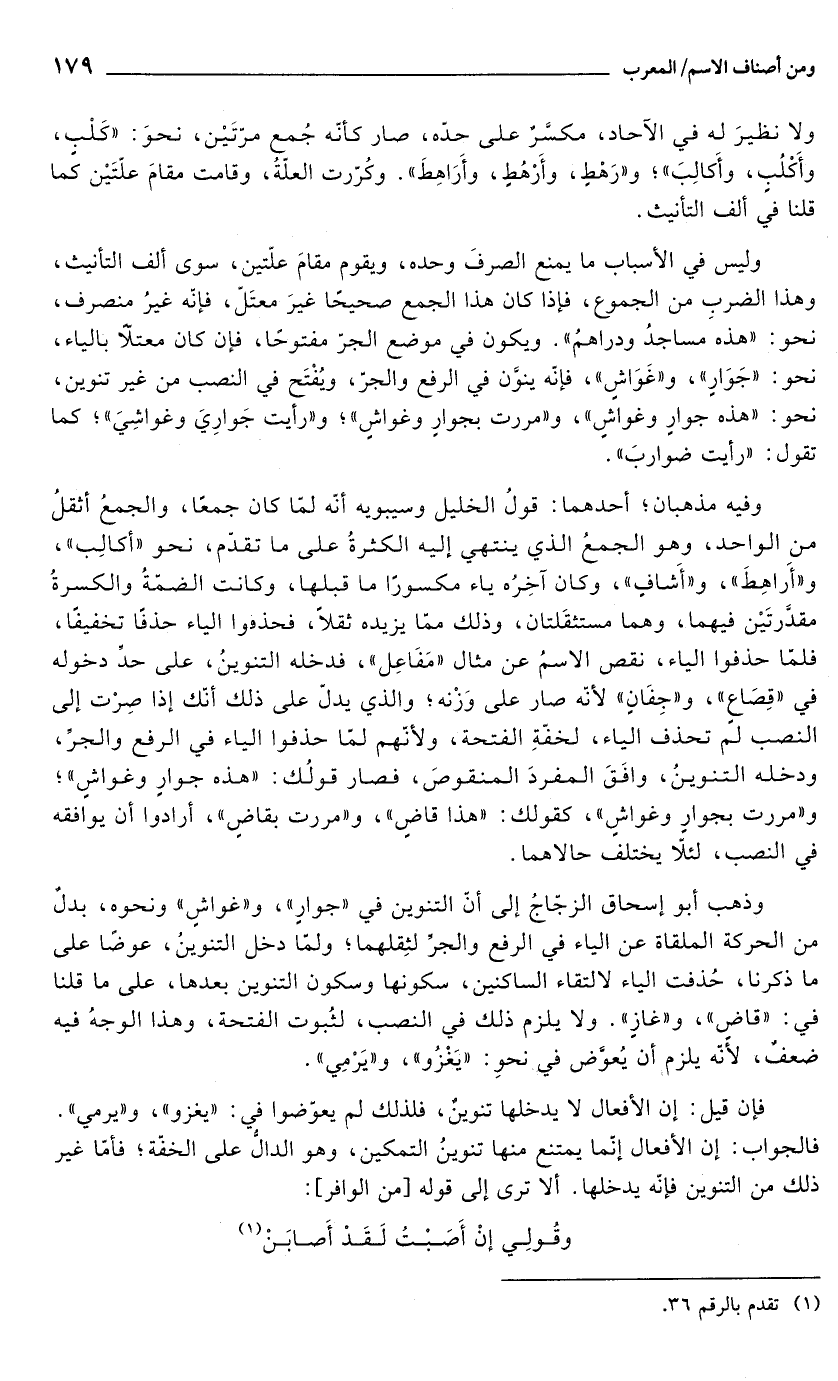 وذهب أبو إسحاق الزجّاجُ إلى أنّ التنوين في "جوارٍ"، و"غواشٍ" ونحوه، بدلٌ من الحركة الملقاة عن الياء في الرفع والجرَّ لثِقلهما؛ ولمّا دخل التنوينُ، عوضًا على ما ذكرنا، حُذفت الياء لالتقاء الساكنين، سكونها وسكون التنوين بعدها، على ما قلنا في: "قاضٍ"، و"غازٍ". ولا يلزم ذلك في النصب، لثُبوت الفتحة، وهذا الوجهُ فيه ضعفٌ، لأَنّه يلزم أن يُعوَّض في نحوِ: "يَغْزُو"، و"يَرْمِي".