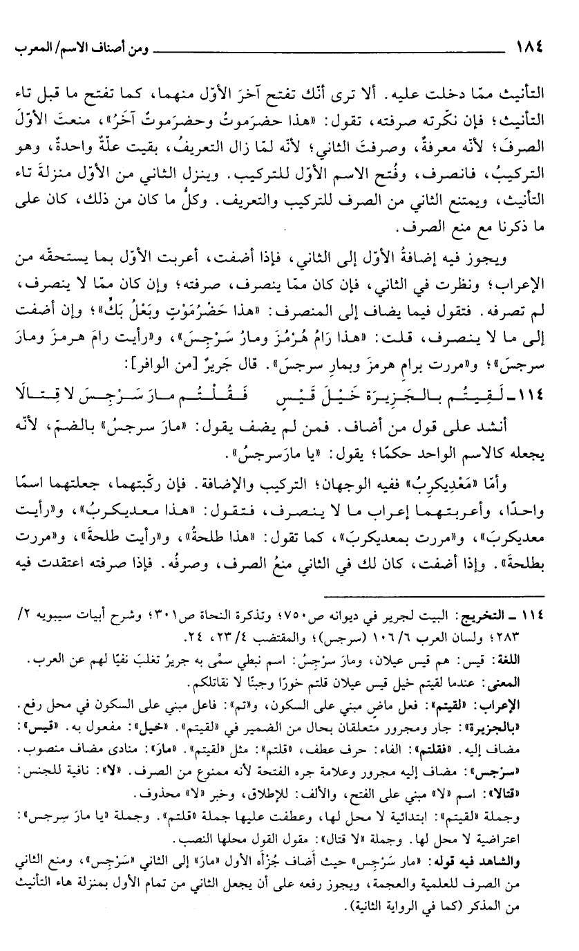 114 - التخريج: البيت لجرير في ديوانه ص 750؛ وتذكرة النحاة ص 301؛ وشرح أبيات سيبويه 2/ 283؛ ولسان العرب 6/ 106 (سرجس)؛ والمقتضب 4/ 23، 24.